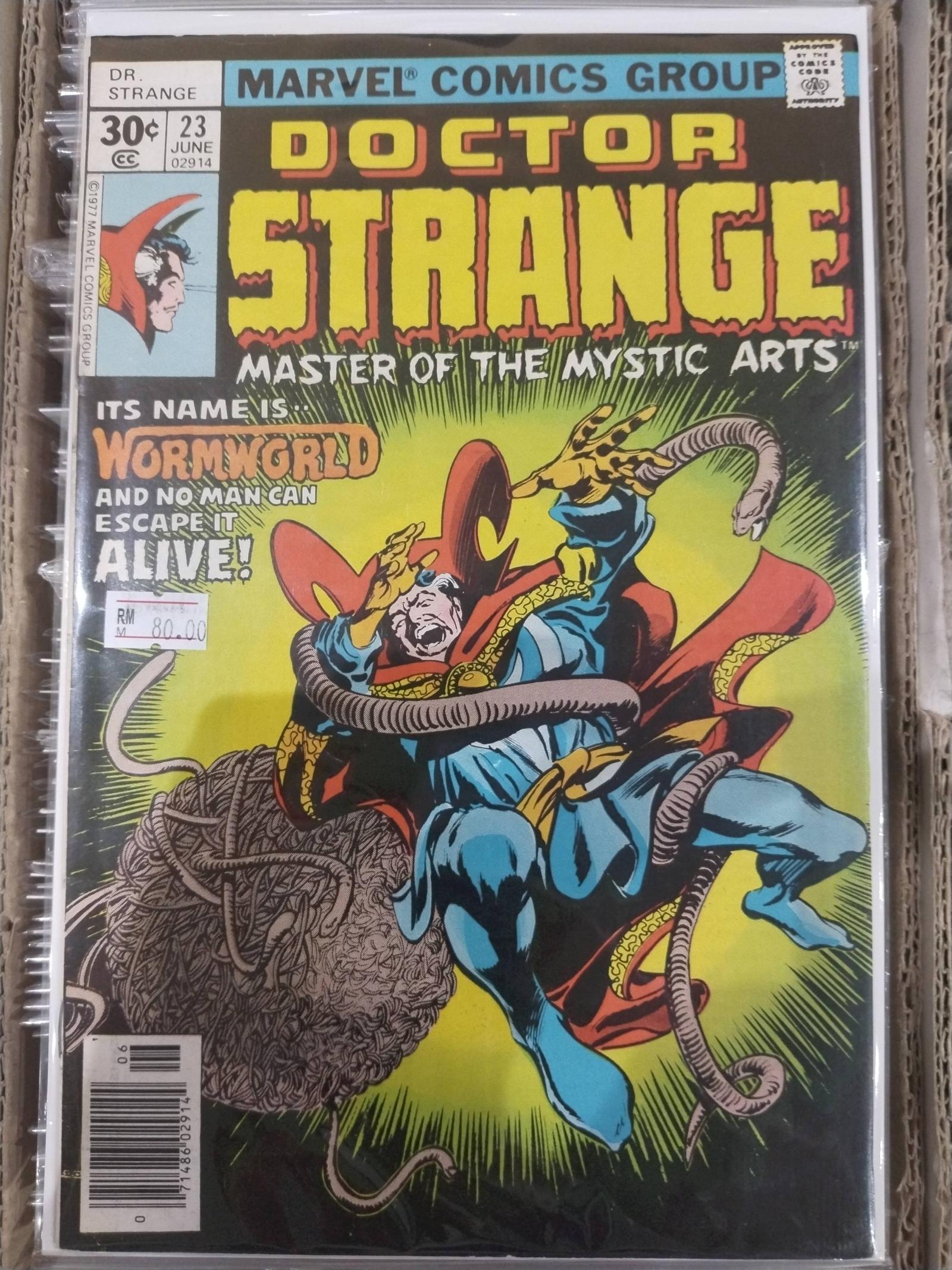 Doctor Strange #23 & 24 from Marvel Comics, published in June 1977. Cover art features Doctor Strange in a perilous encounter with 'Wormworld'. This issue is part of the "Master of the Mystic Arts" series. The comic is notable for its classic 1970s artwork by artist Gene Colan. The comic is in a protective bag but not graded or slabbed.