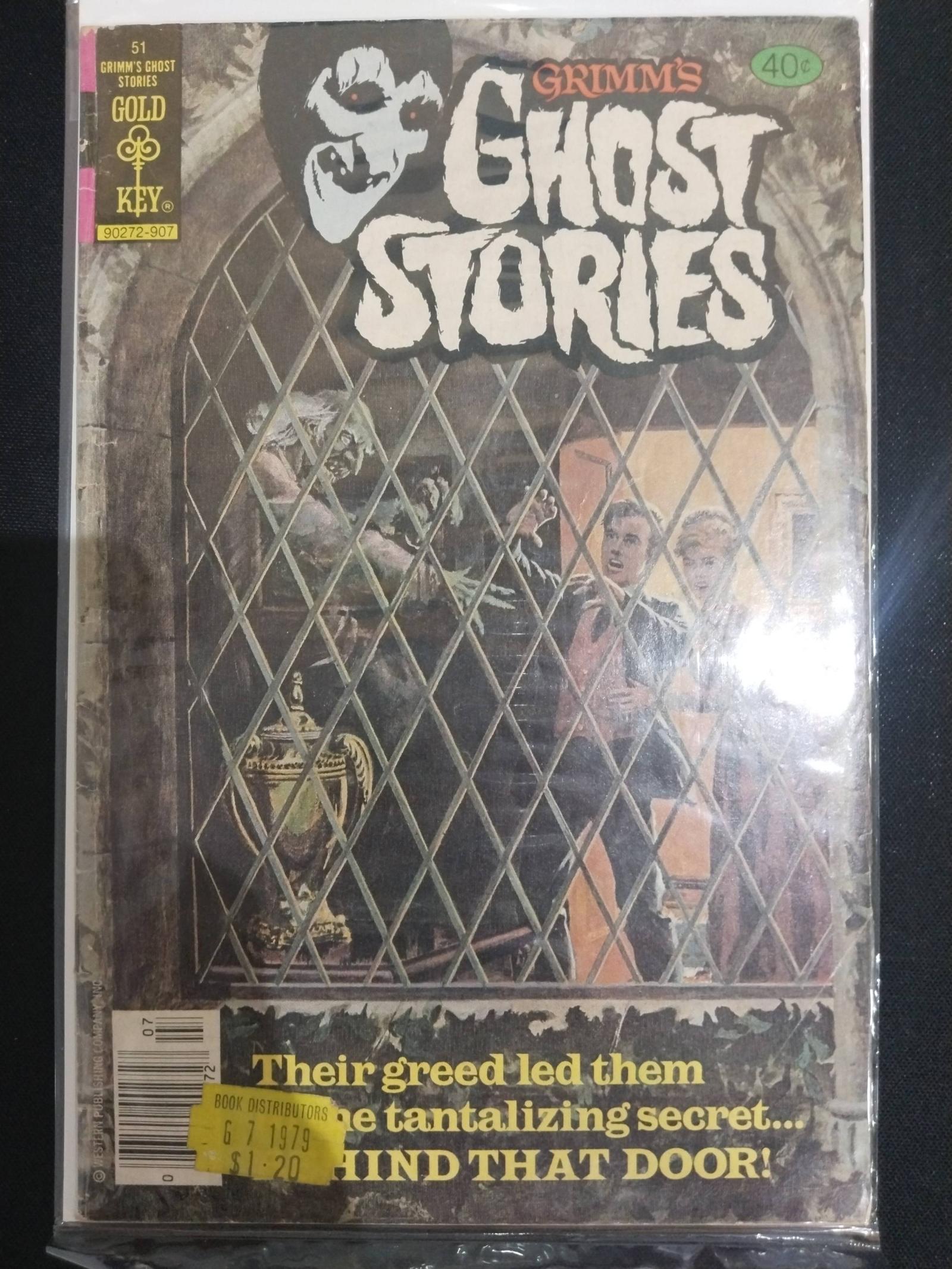 Grimm's Ghost Stories issue #51 published by Gold Key Comics. Featuring eerie horror tales, with cover art depicting a terrifying scene behind a lattice door. The comic has a cover price of 40 cents and dates to 1979. Artist not specified. This issue is not graded or slabbed.