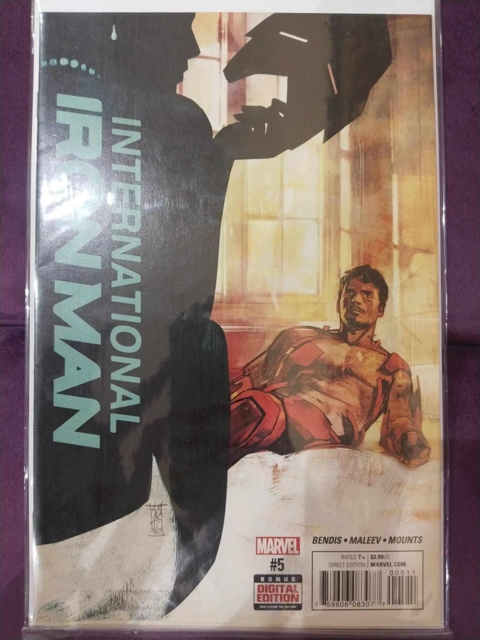 International Iron Man issue #5 by Marvel. Written by Brian Michael Bendis with art by Maleev and Mounts. This issue features a significant storyline for Iron Man and is a direct edition. The cover art highlights Iron Man in a dramatic pose. No grading or slab information is provided.