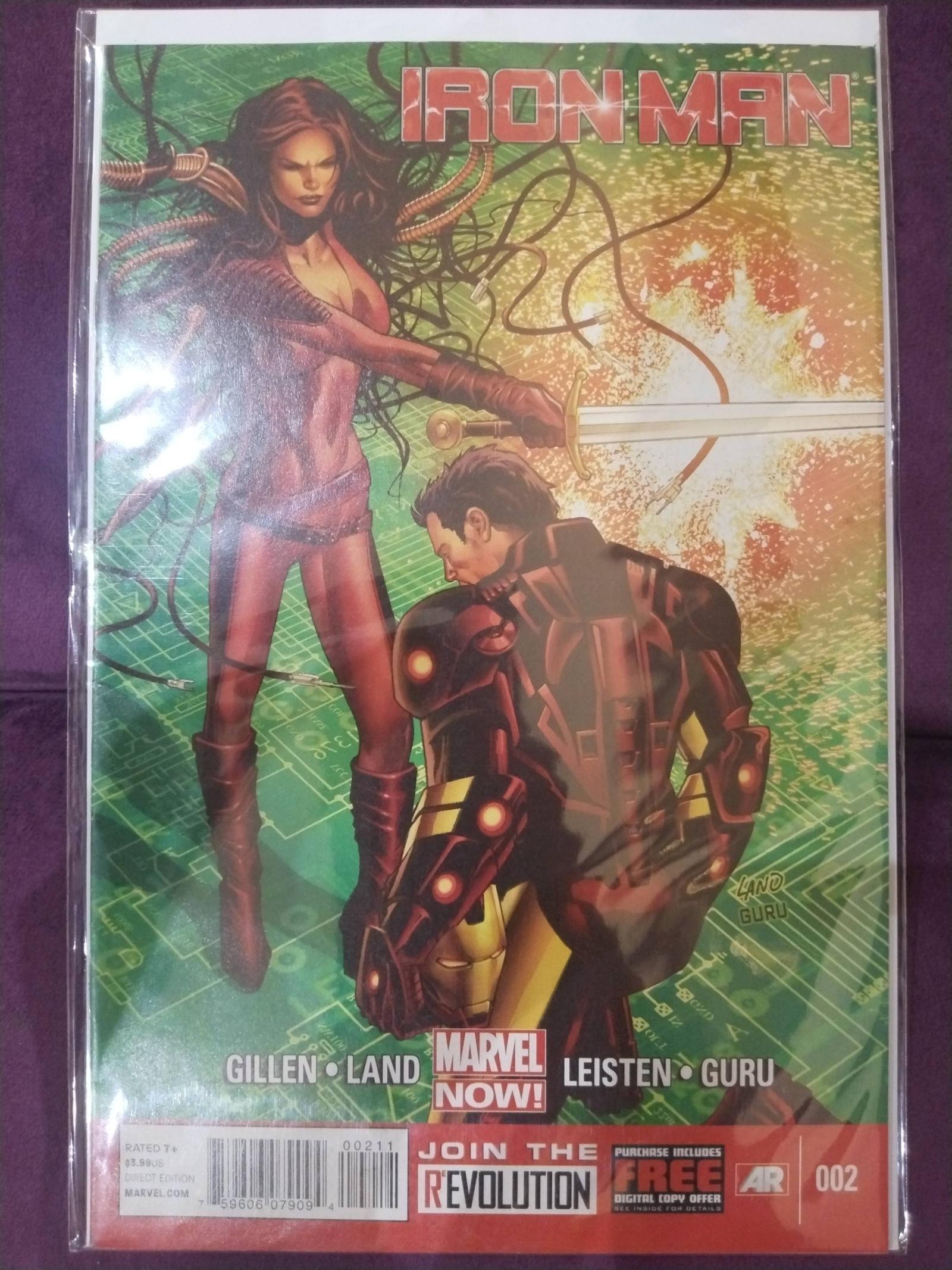 Iron Man #2 from the Marvel NOW! series, featuring artwork by Land and Guru. This issue highlights the intense and dynamic storytelling of writer Gillen and artist Land. The comic is in bagged condition and includes a digital copy offer.