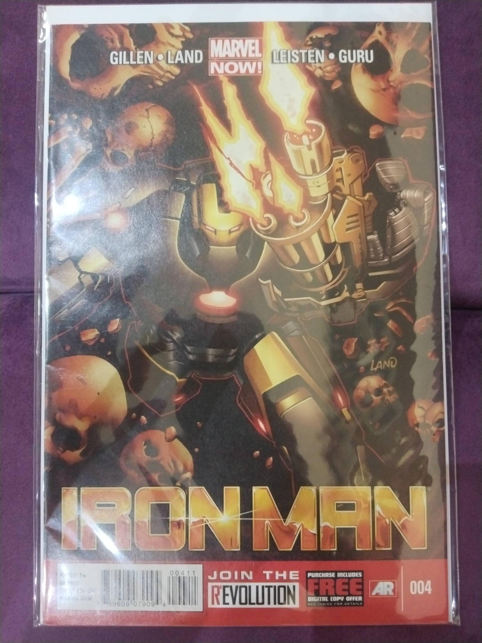 Iron Man issue #4 from the Marvel Now! series, featuring art by Land and writing by Gillen, Leisten & Guru. This issue includes a free digital copy offer. The cover showcases Iron Man in a fiery combat stance surrounded by skull motifs. Part of an ongoing Marvel series.