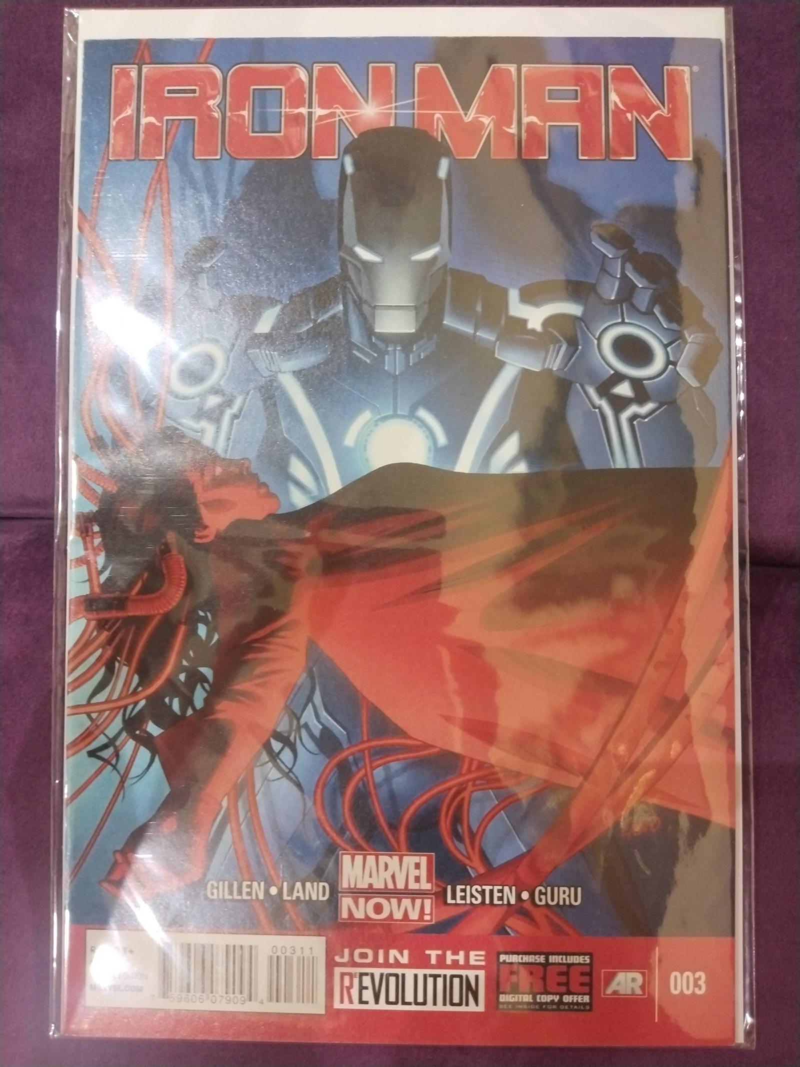 Iron Man issue #3 from the Marvel NOW! series featuring artwork by Land and Leisten. This comic is part of the storyline written by Gillen with art contributions from Land, Leisten, and Guru. The cover shows Iron Man holding a character connected to many wires. No grading or slab information available.