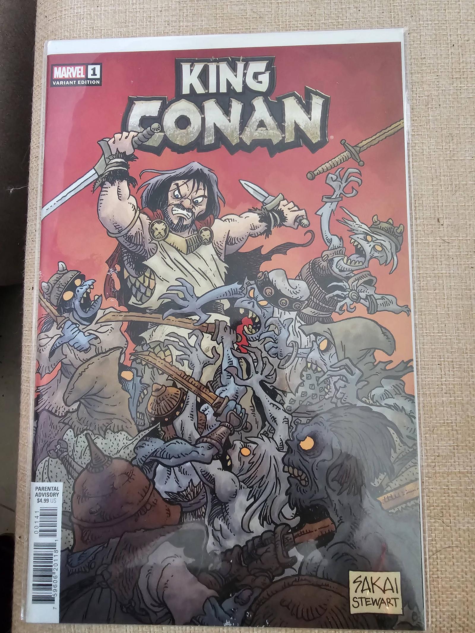 King Conan #1 Marvel variant edition featuring artwork by artist Sakai Stewart. This issue showcases a dynamic cover with Conan battling undead creatures, highlighting the unique art style. A collectible comic for fans of the King Conan series.