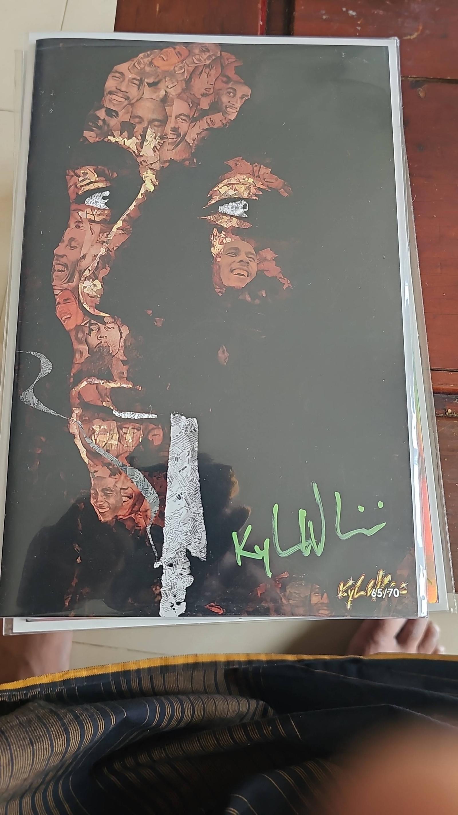 This unique comic cover features an artistic portrayal of Bob Marley composed of various facial images, created by artist Kyle Willis, It is a limited edition piece, numbered 65 out of 70, and is signed by the artist. A special collectible for fans of Bob Marley and comic art lovers alike.
