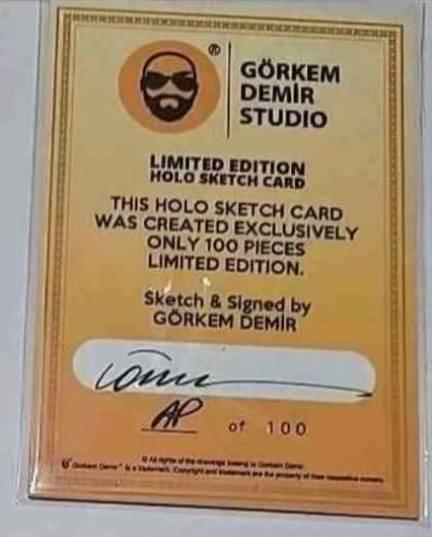 Limited edition holo sketch card created exclusively by Görkem Demir Studio. This unique collectible is hand-sketched and signed by artist Görkem Demir. Only 100 pieces were made, with this card marked as an artist proof (AP). A rare and special item for collectors and fans of Görkem Demir's artwork.