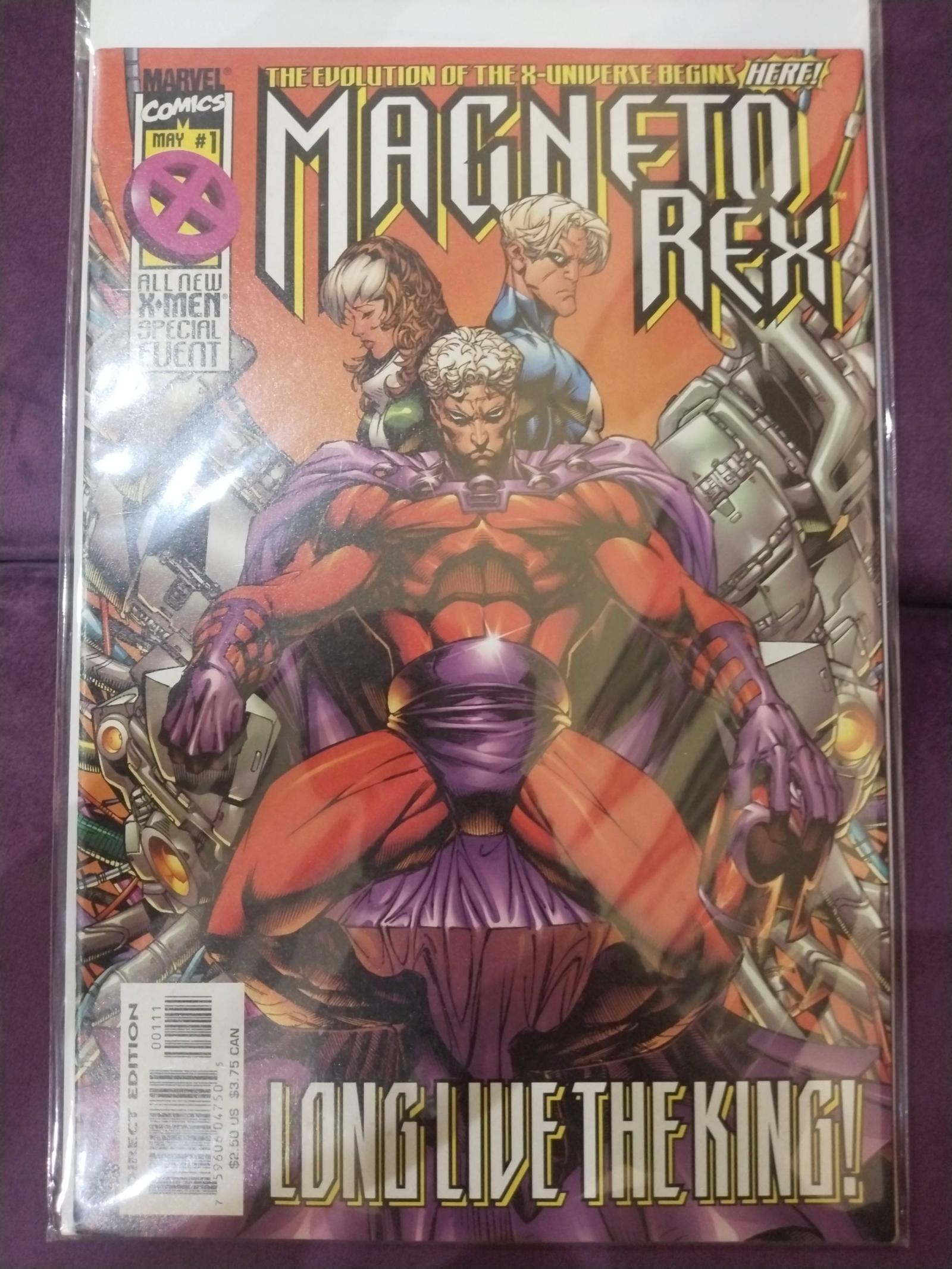 Magneto Rex #1 from Marvel Comics, released in May 1999. Features the X-Men characters and the evolution of the X-Universe. Cover art highlights Magneto in a commanding pose. A special event in the All New X-Men series. Artist information is not provided on the cover. The comic is a direct edition and is not slabbed or graded.