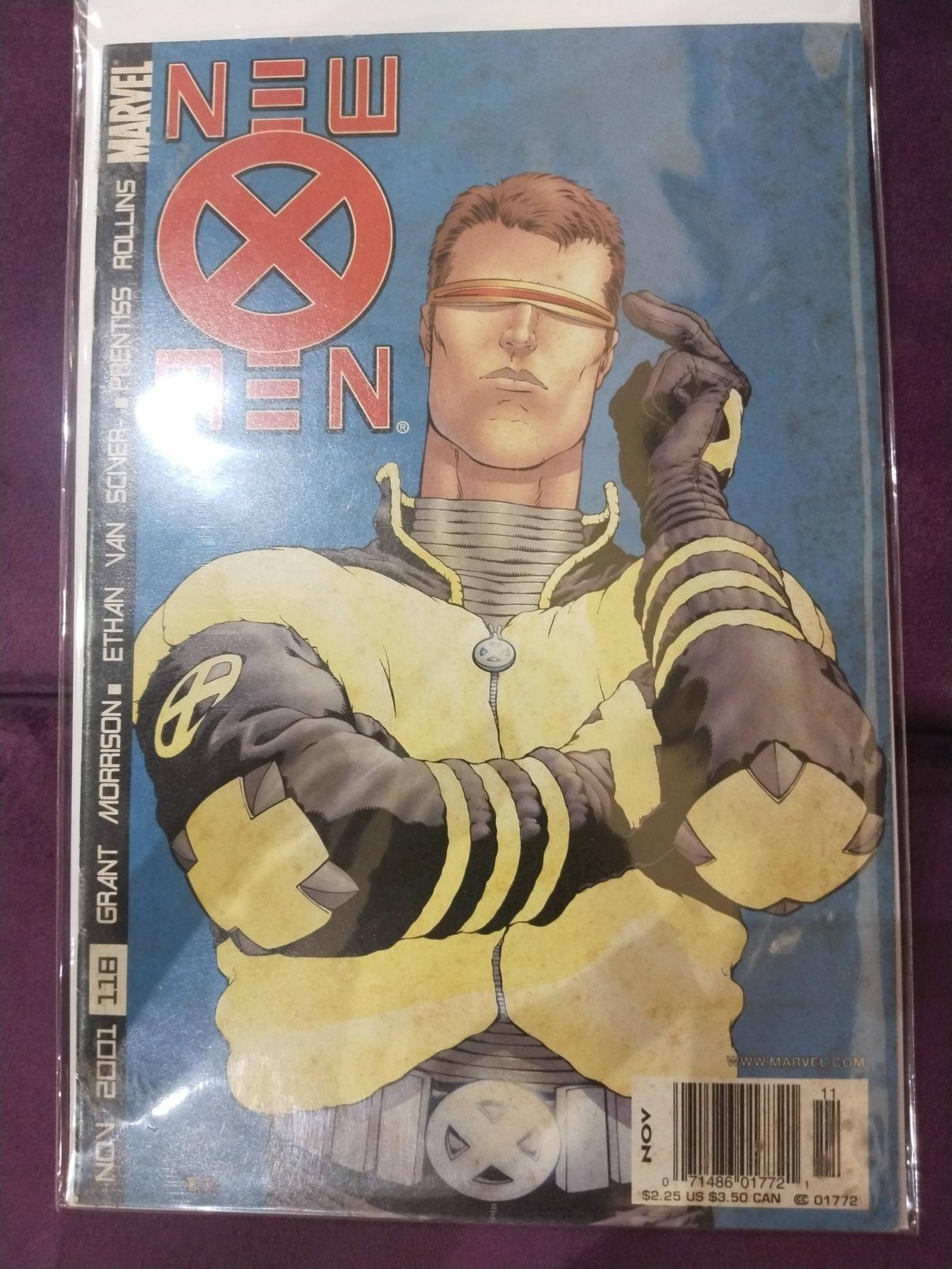 (Cover minor mold and rusty) New X-Men issue #118 from Marvel Comics, published in November 2001. Written by Grant Morrison with artwork by Ethan Van Sciver and Mark Pennington. Features Cyclops on the cover in his distinctive yellow and black costume. A key series run by Morrison, this issue is part of the critically acclaimed New X-Men series.