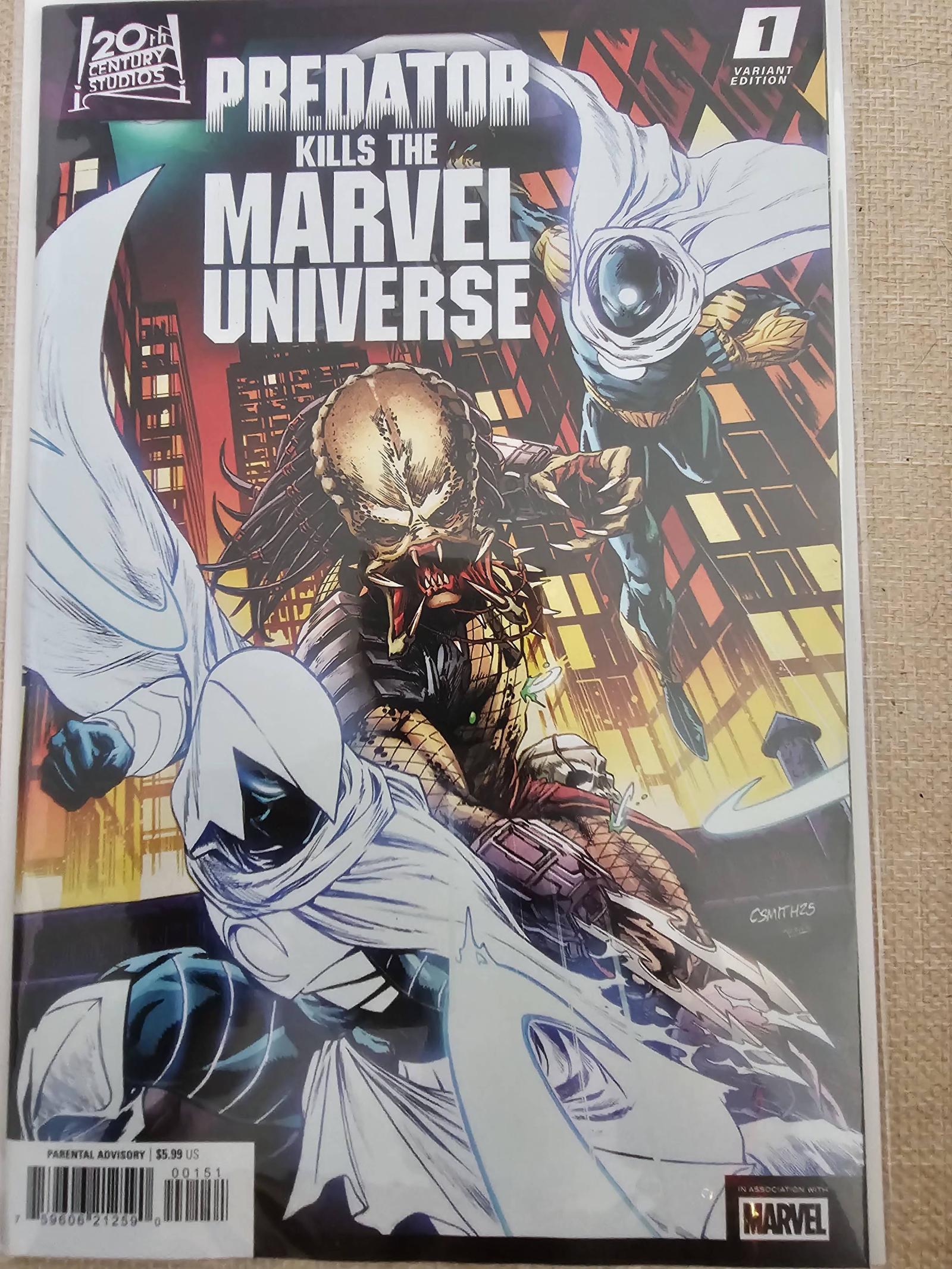 Predator Kills the Marvel Universe #1 Variant Edition by 20th Century Studios and Marvel. This issue features art by C. Smith (as signed on cover) and showcases a thrilling crossover event where Predator confronts iconic Marvel characters. A must-have for fans of both Marvel and Predator franchises. The comic is a variant edition and includes a parental advisory. Year of release is 2025.