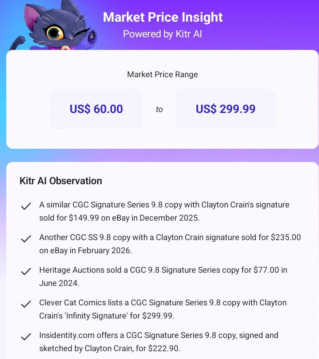 Collectible / market notes: This is a collectible-grade, display-ready copy ideal for fans of Crain’s art, Ghost Rider variants, and signed modern key issues. The combination of a popular artist cover, variant edition, and CGC Signature Series 9.8 grading enhances both display appeal and secondary-market desirability. The yellow label authentication removes signature authenticity concerns for resale or long-term holding. Slab condition appears clean with no visible inner page issues from the provided images.