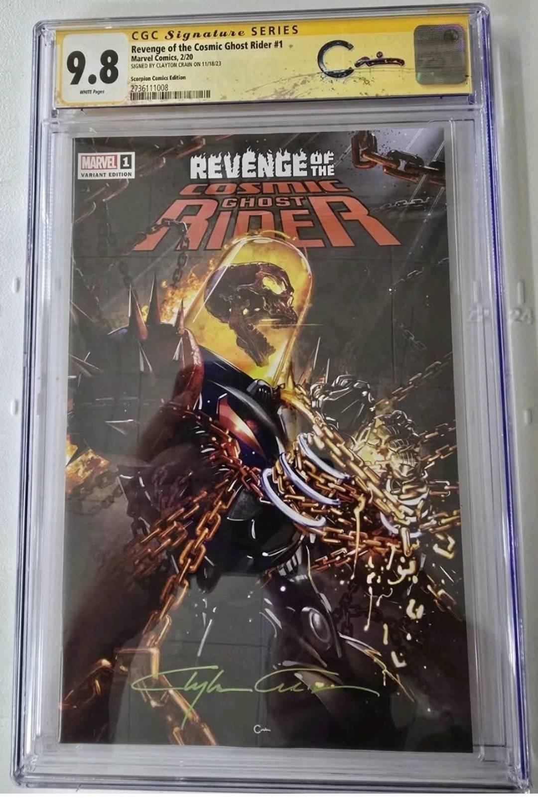 This is a CGC Signature Series graded 9.8 copy of Revenge of the Cosmic Ghost Rider #1 (Variant Edition) from Marvel Comics, dated 2020. The comic is signed by artist Clayton Crain, known for his distinctive and dynamic comic book artwork. This special edition is a Scorpion Comics variant, making it a unique collectible for fans and comic collectors.