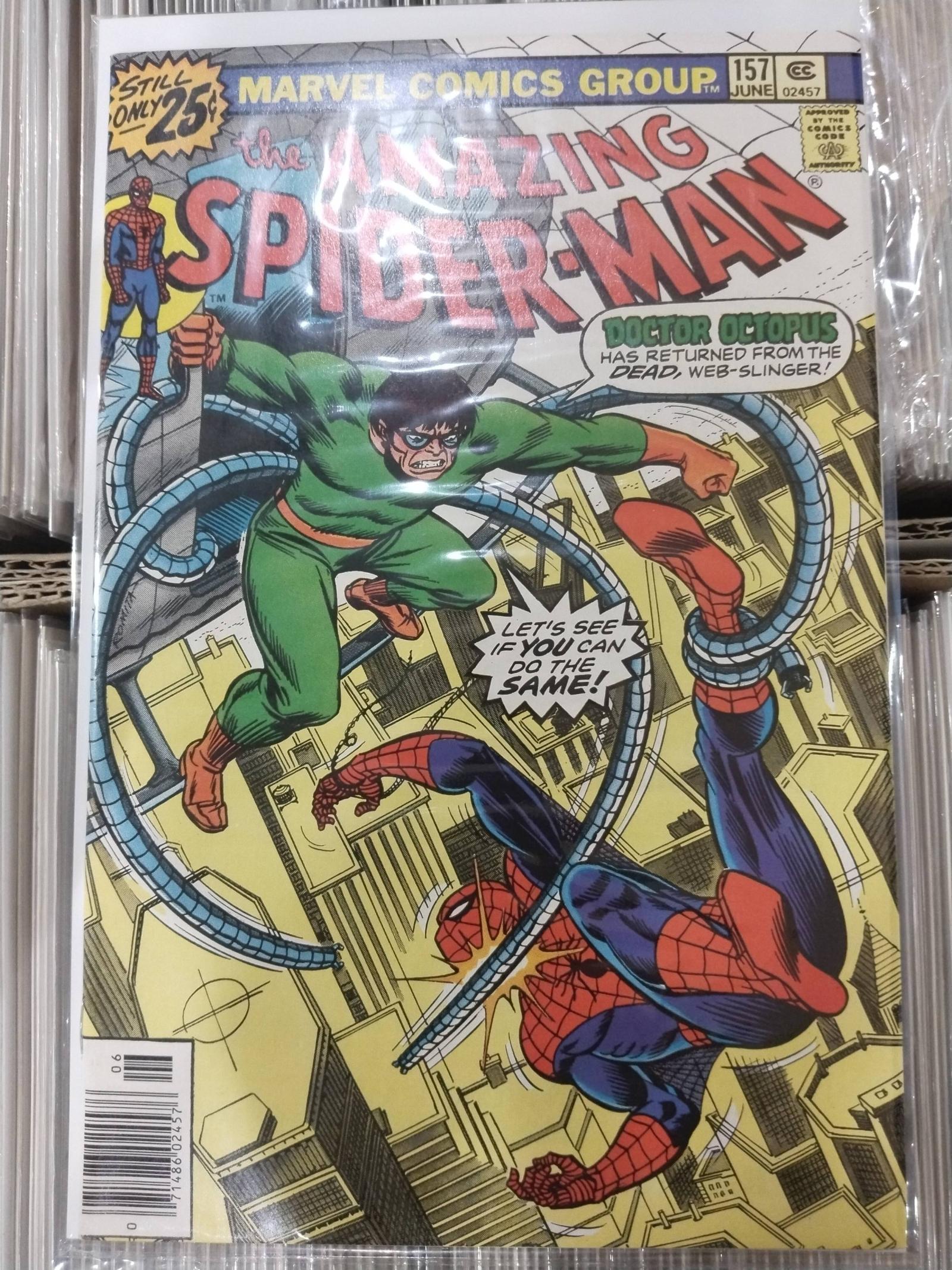 The Amazing Spider-Man issue #157, published by Marvel Comics in 1976. Cover art features Spider-Man battling Doctor Octopus, who is returning from the dead. The comic is a classic example of the series creation by artist John Romita Sr. and writer Len Wein. This copy is not slabbed or graded.