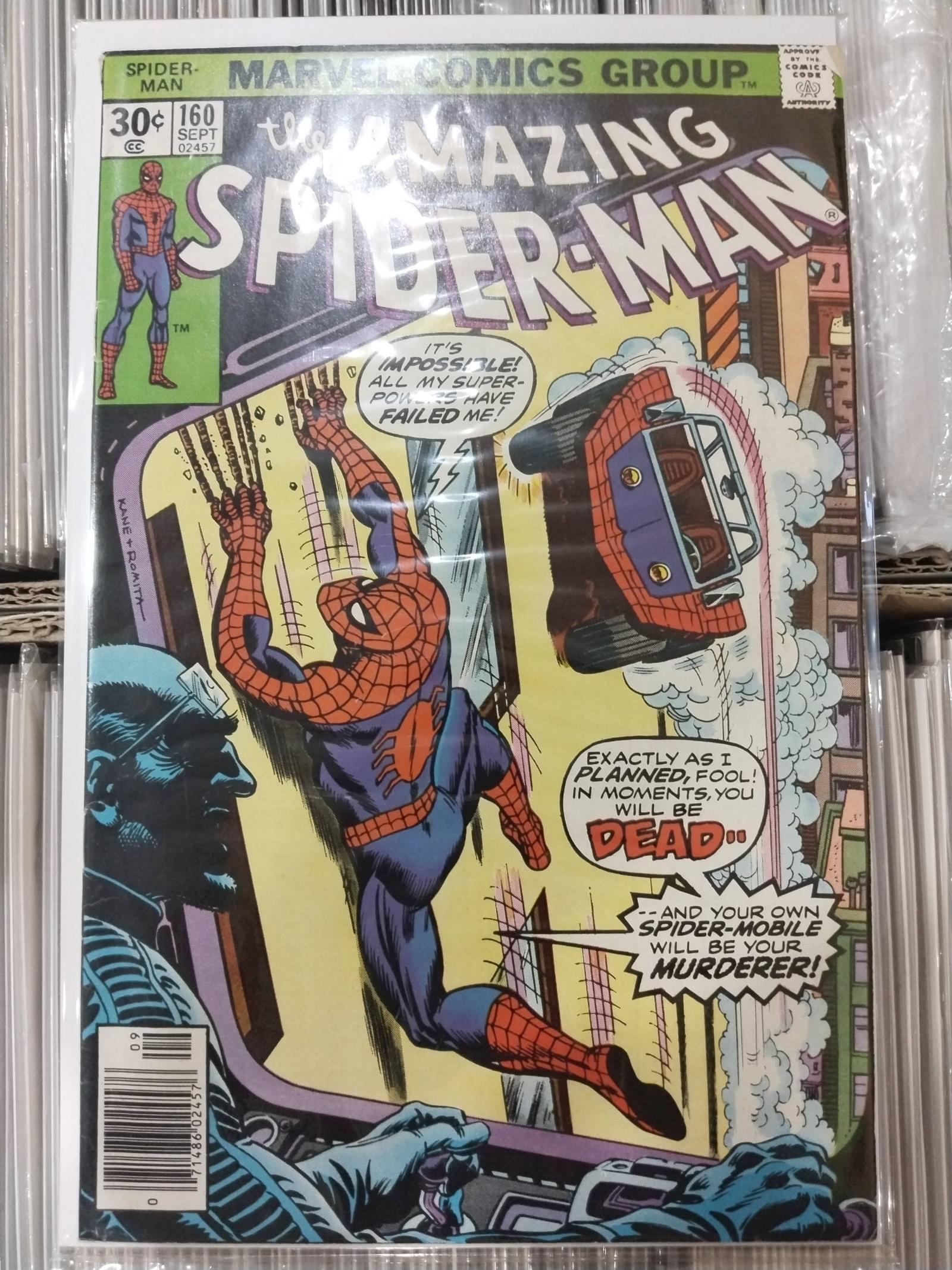 The Amazing Spider-Man issue #160 from Marvel Comics, published in 1976. Cover art by Gil Kane and John Romita Sr. Features Spider-Man in a dramatic scene with the Spider-Mobile. Classic Silver Age comic highly collectible.