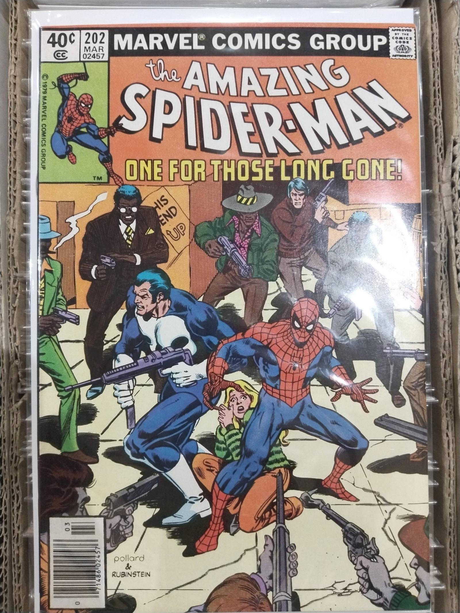 The Amazing Spider-Man issue #202, published in March 1979 by Marvel Comics. Featuring art by Pollard & Rubinstein. This issue is titled 'One for Those Long Gone!' and showcases Spider-Man with supporting characters in a dramatic scene. The comic is in a protective sleeve but is not graded or slabbed.