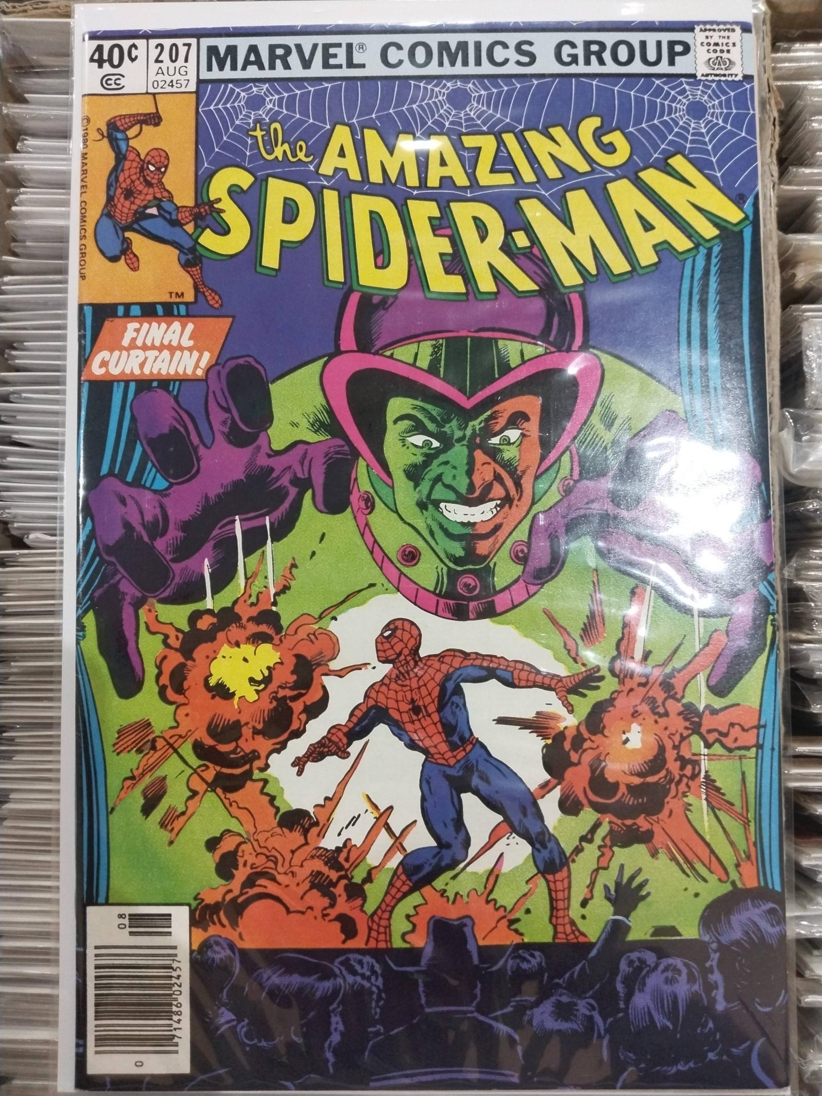 The Amazing Spider-Man issue #207 from Marvel Comics, published in August 1979. Features iconic cover art by artist Gil Kane. Marked by the 'Final Curtain!' tagline, this issue depicts Spider-Man in battle with the villain Mysterio. Classic Marvel storytelling with detailed artwork, suitable for collectors.
