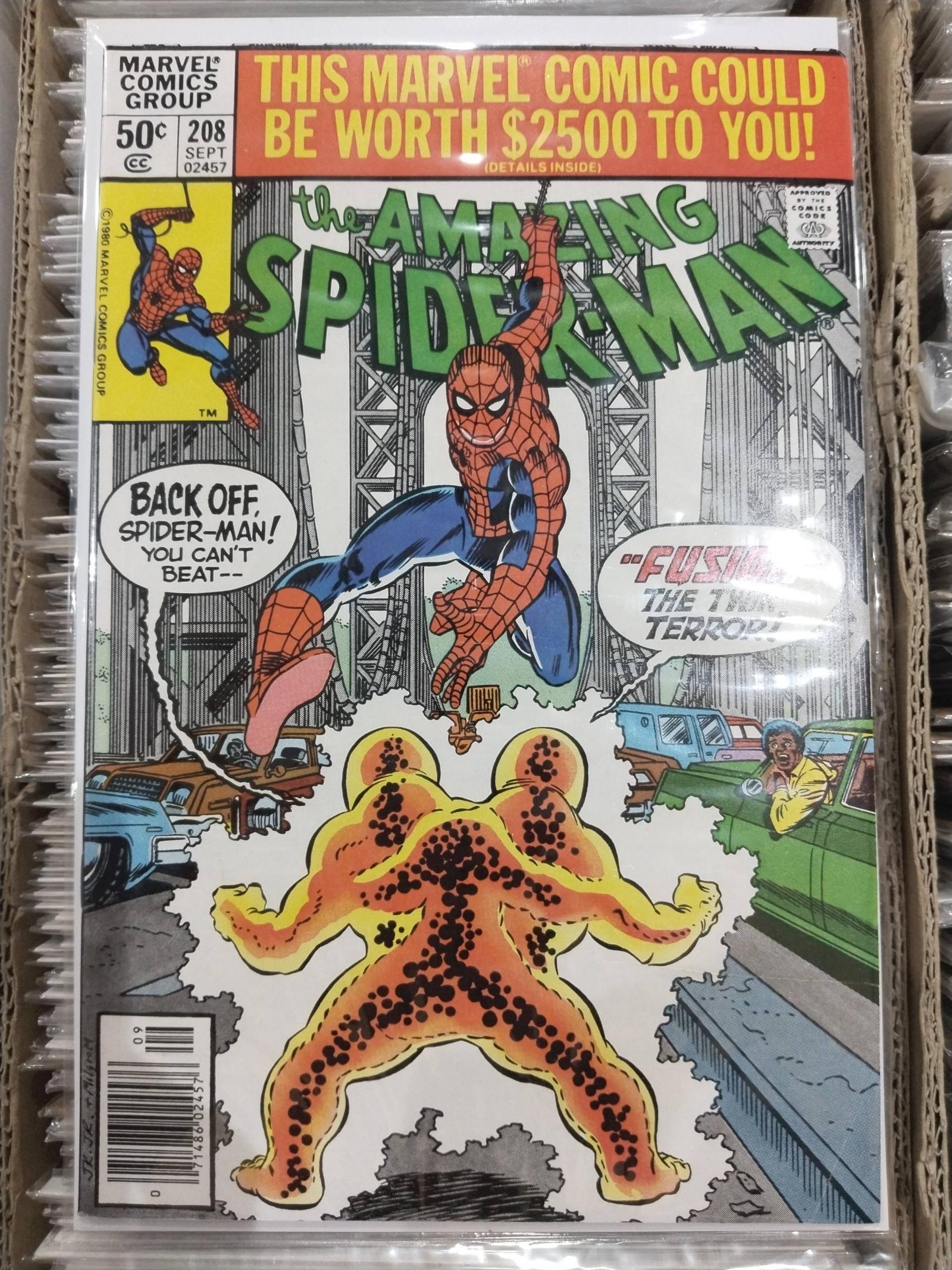 This is issue #208 of The Amazing Spider-Man series published by Marvel Comics in 1980. The cover features Spider-Man facing off against the villain known as Fusion, the Toxic Terror. The comic is part of the classic Spider-Man series and originally sold for 50 cents. The artist for this issue is not explicitly stated on the cover. The comic is not graded or slabbed.