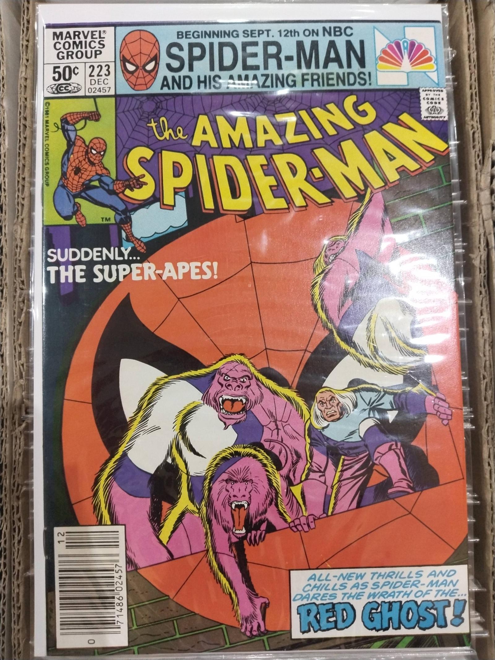 The Amazing Spider-Man issue #223 published by Marvel Comics in December 1981. Featuring the story 'Suddenly... The Super-Apes!' and the Red Ghost. Cover art by John Romita Sr. This comic is in a protective sleeve. Not graded or slabbed.