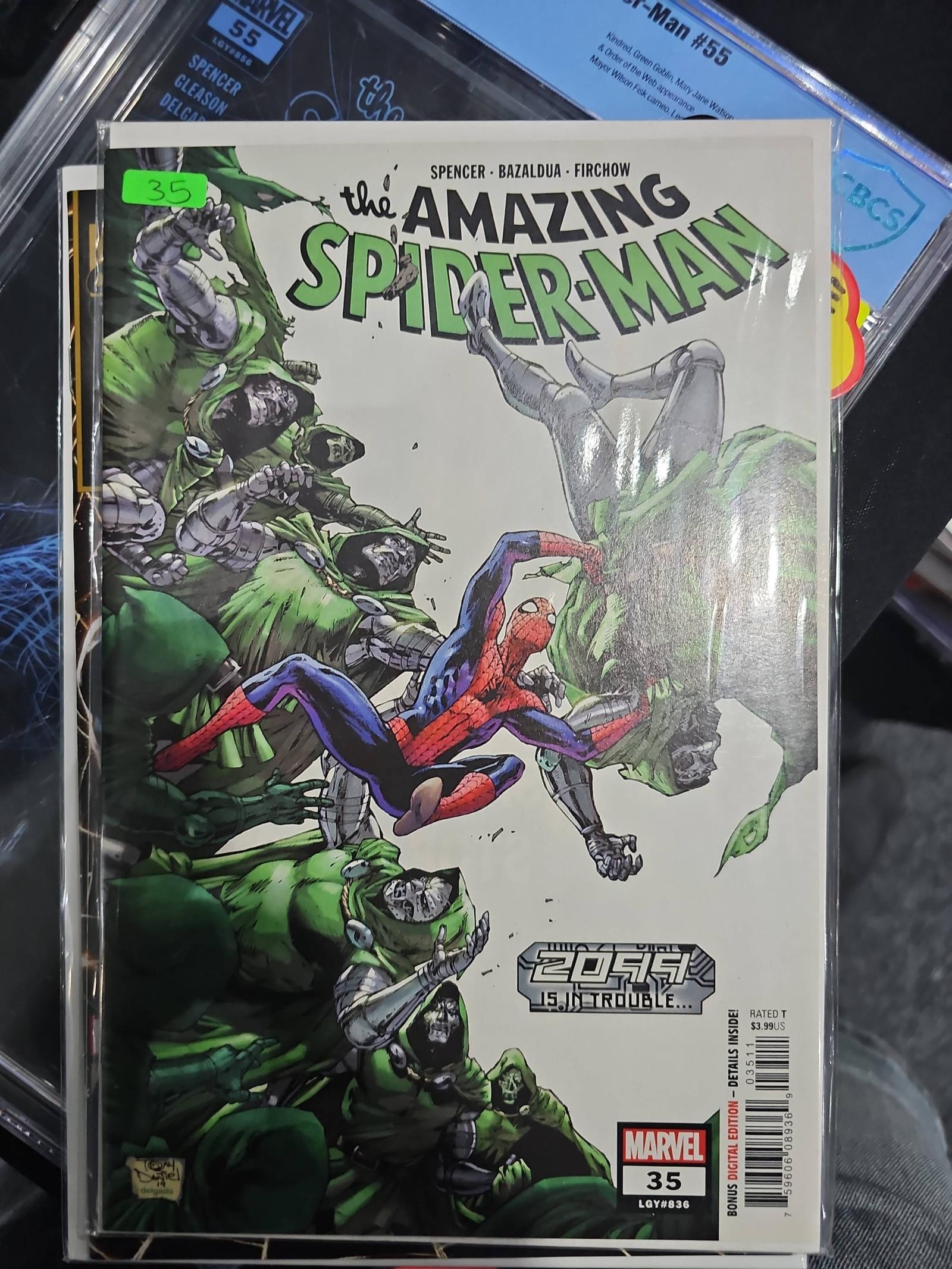 The Amazing Spider-Man issue #35, featuring art by Carlos Gomez Bazaldua and inks by Firchow. This comic is part of the 'Spider-Man 2099' story arc and showcases Spider-Man in intense action surrounded by multiple foes. Published by Marvel in 2019.