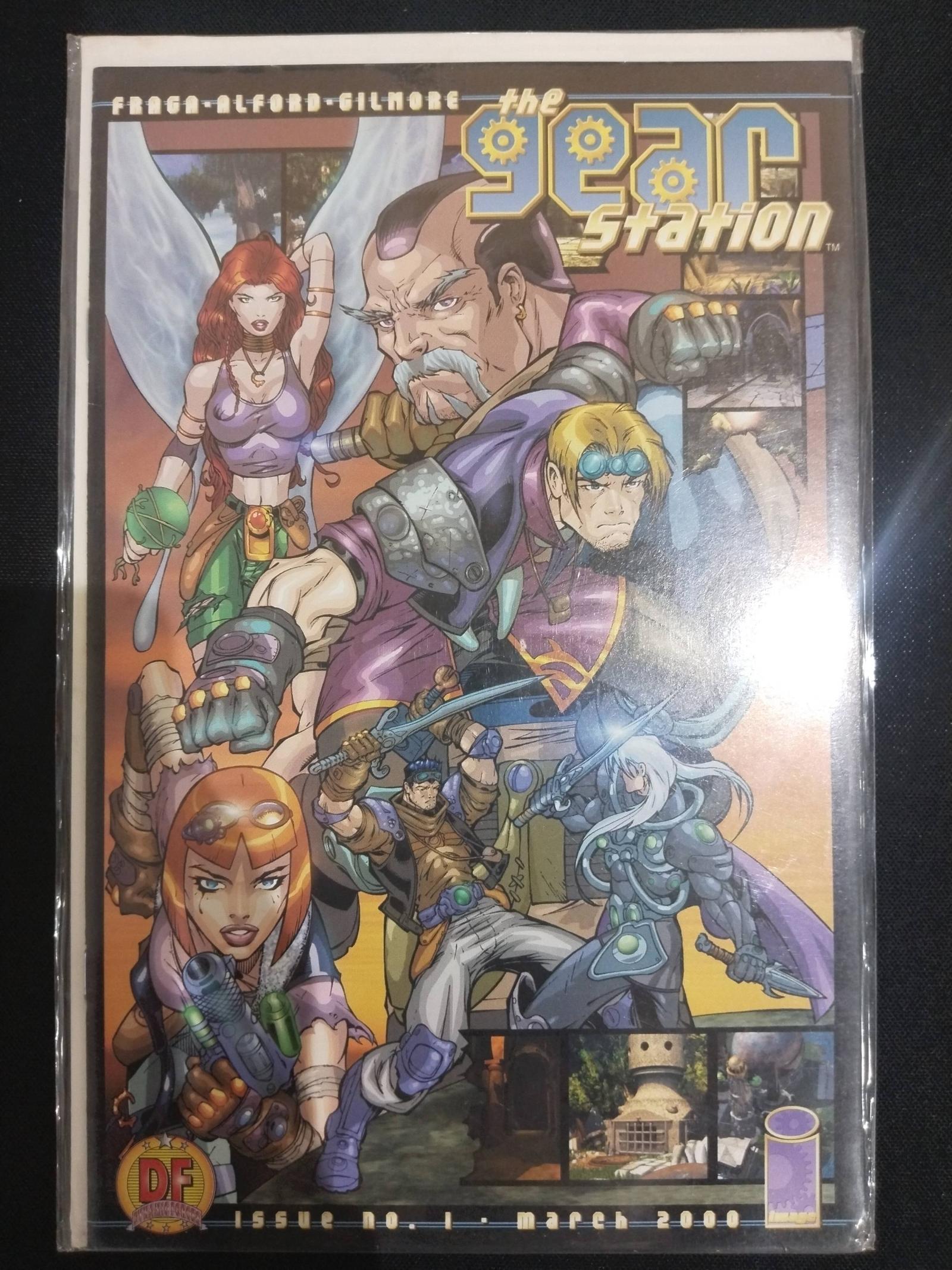 This comic, The Gear Station Issue #1, DF COA. released in March 2000, features the artwork of Fraga, Alford, and Gilmore. It is a part of the Gear Station series, known for its dynamic characters and detailed illustrations. The cover showcases key characters in action poses, emphasizing the comic's adventurous and mechanical themes.