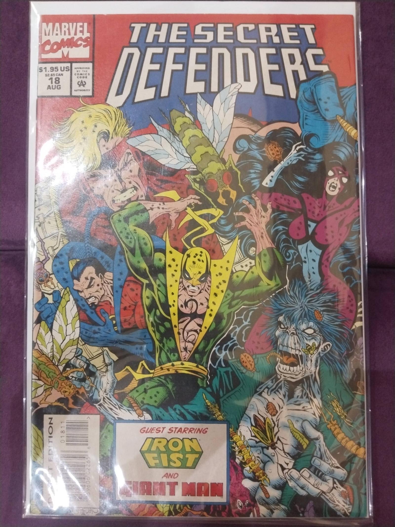 The Secret Defenders issue #18 featuring guest stars Iron Fist and Giant Man. Artwork from Marvel Comics, published in August 1987. Cover art highlights dynamic battle scenes with vibrant colors. Artist details are not specified.
