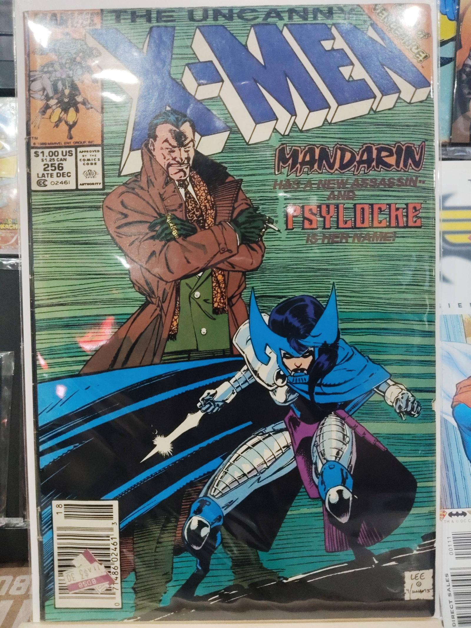 The Uncanny X-Men issue #256 features Mandarin and Psylocke on the cover. This comic was published by Marvel in 1989. The cover art is by artist Barry Windsor-Smith and Jim Lee. Highlights include the Mandarin having a new assassin and Psylocke as her name. The comic is a late December issue priced at $1.00 US. No grading or slab information is available.