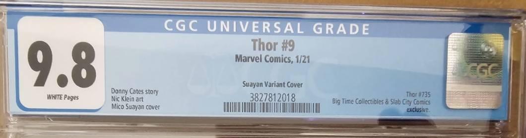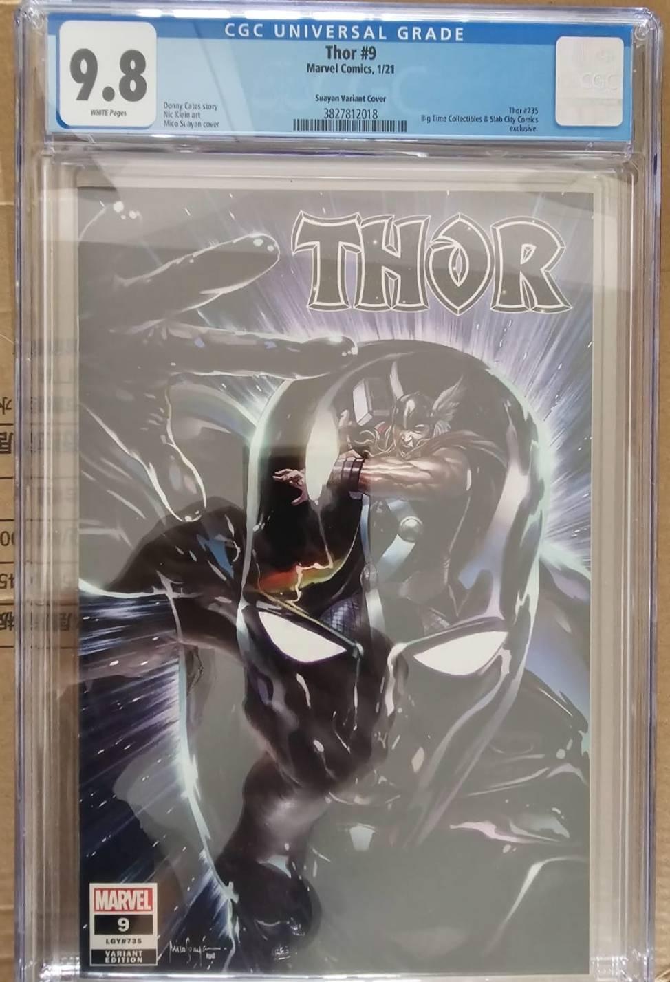 Thor #9 from Marvel Comics, released in January 2021. This is the Suayan Variant Cover featuring artwork by Mico Suayan. The story is by Donny Cates with Nick Klein as the interior artist. This copy is CGC graded 9.8 with white pages, making it a high-grade collectible. It is an exclusive edition from Big Time Collectibles & Slab City Comics.