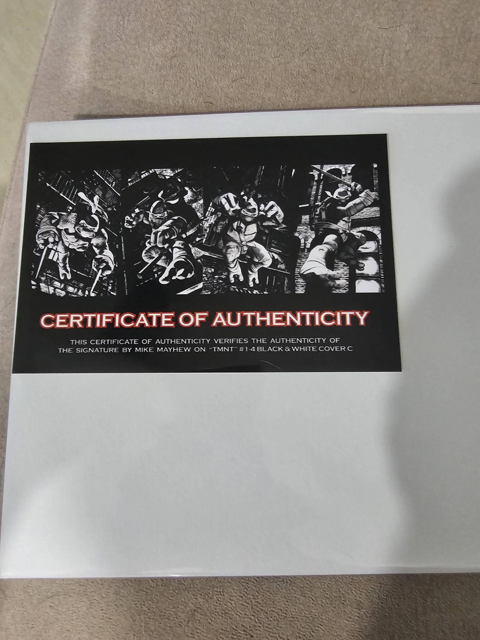 Included is a printed Certificate of Authenticity that specifically verifies Mike Mayhew’s signature on the TMNT #1- Black & White Cover C series, providing provenance for the signature. The COA is supplied with the lot.