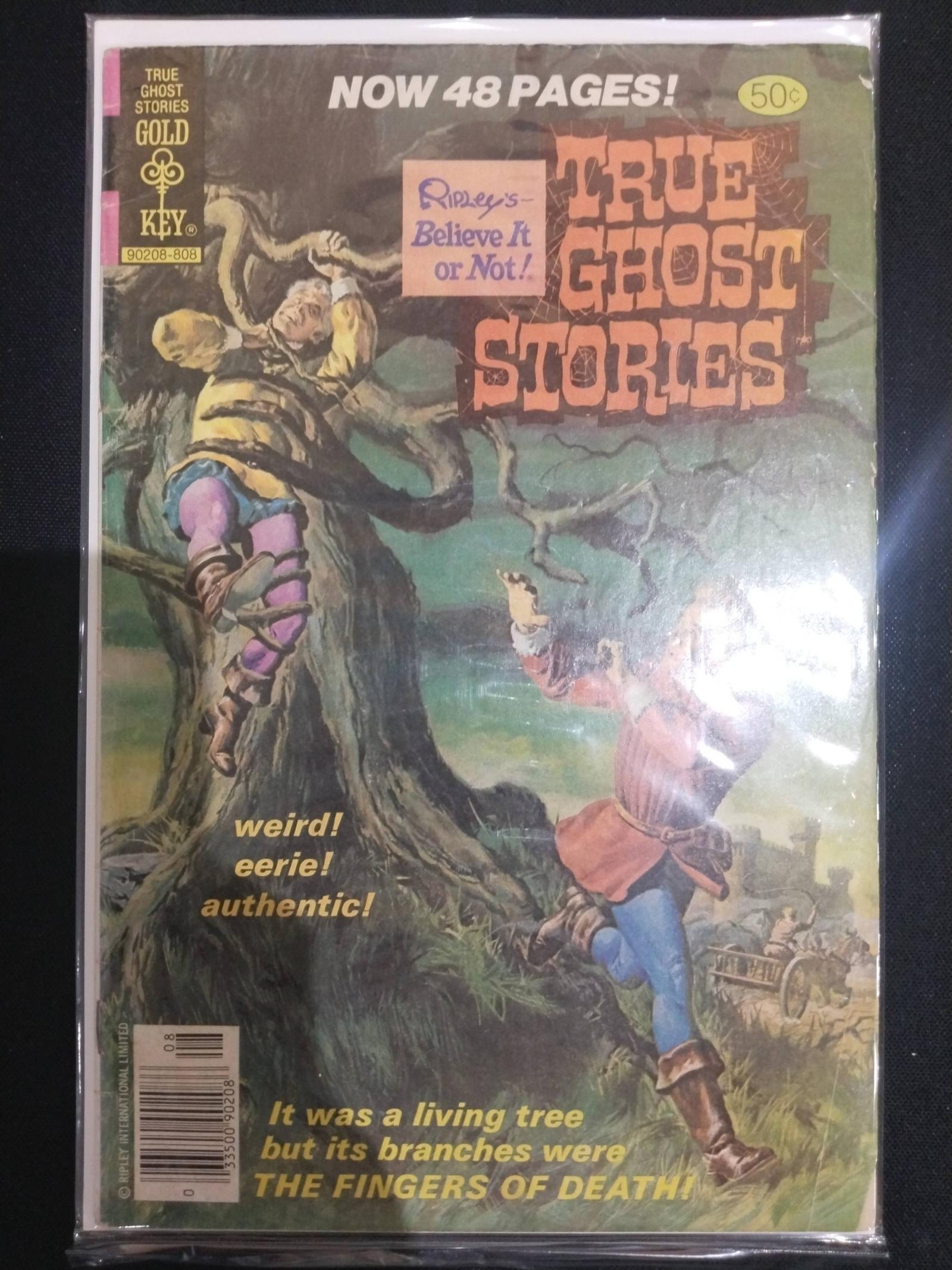 True Ghost Stories issue #8 by Gold Key Comics features eerie and authentic ghost tales, including the story 'It was a living tree but its branches were THE FINGERS OF DEATH!' This comic includes a Ripley's Believe It or Not! segment. The cover art, characteristic of Gold Key's painted style, adds to its collectible appeal. Price marked at 50 cents. Artist name not specified.