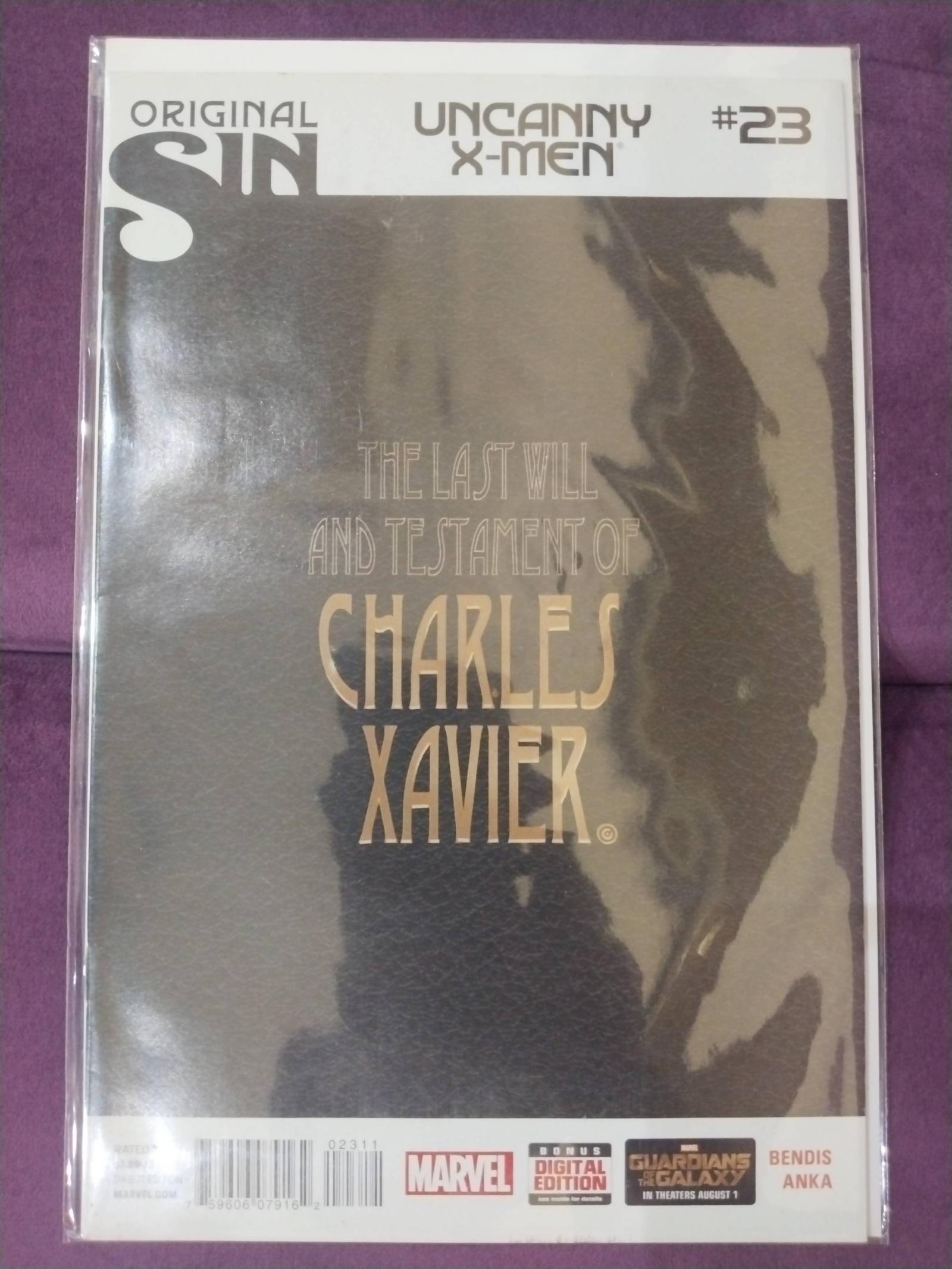 Uncanny X-Men #23 from the Original Sin series by Marvel Comics. This issue features the story 'The Last Will and Testament of Charles Xavier.' Written by Brian Michael Bendis with art by Kris Anka. A significant comic for fans of the X-Men, tied to the Original Sin event. No grading information available.