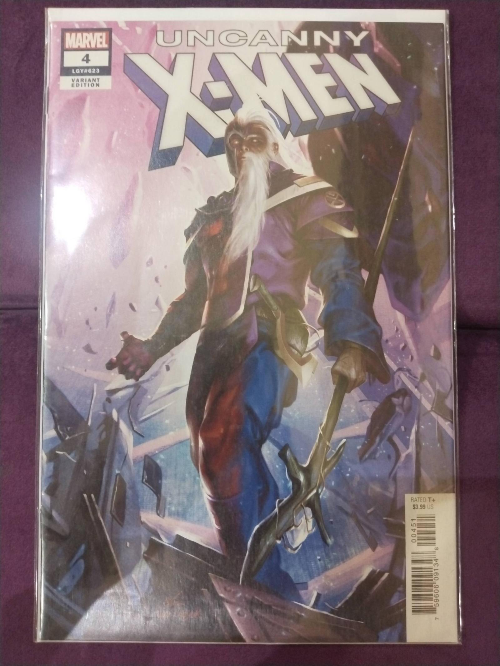 Uncanny X-Men issue #4, a variant edition published by Marvel. The cover features distinctive artwork of an iconic X-Men character wielding a staff. Artist's name is not specified. This comic is bagged and boarded for protection but is not graded or slabbed.