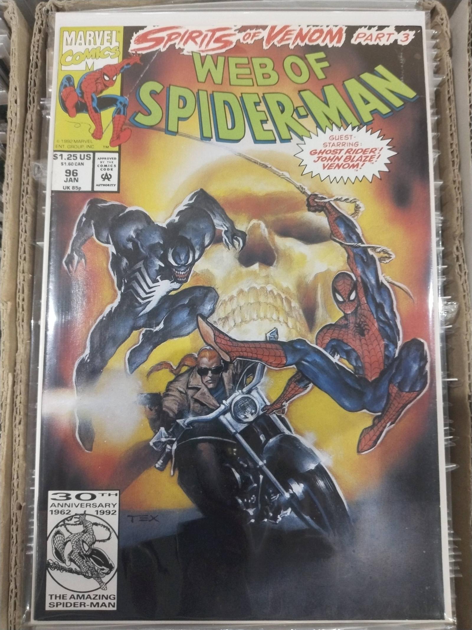 Web of Spider-Man #96 from 1992 featuring 'Spirits of Venom Part 3'. Guest-starring Ghost Rider, John Blaze, and Venom. Cover art by Tex, celebrating 30th Anniversary of The Amazing Spider-Man (1962-1992). No grade or slab information available.