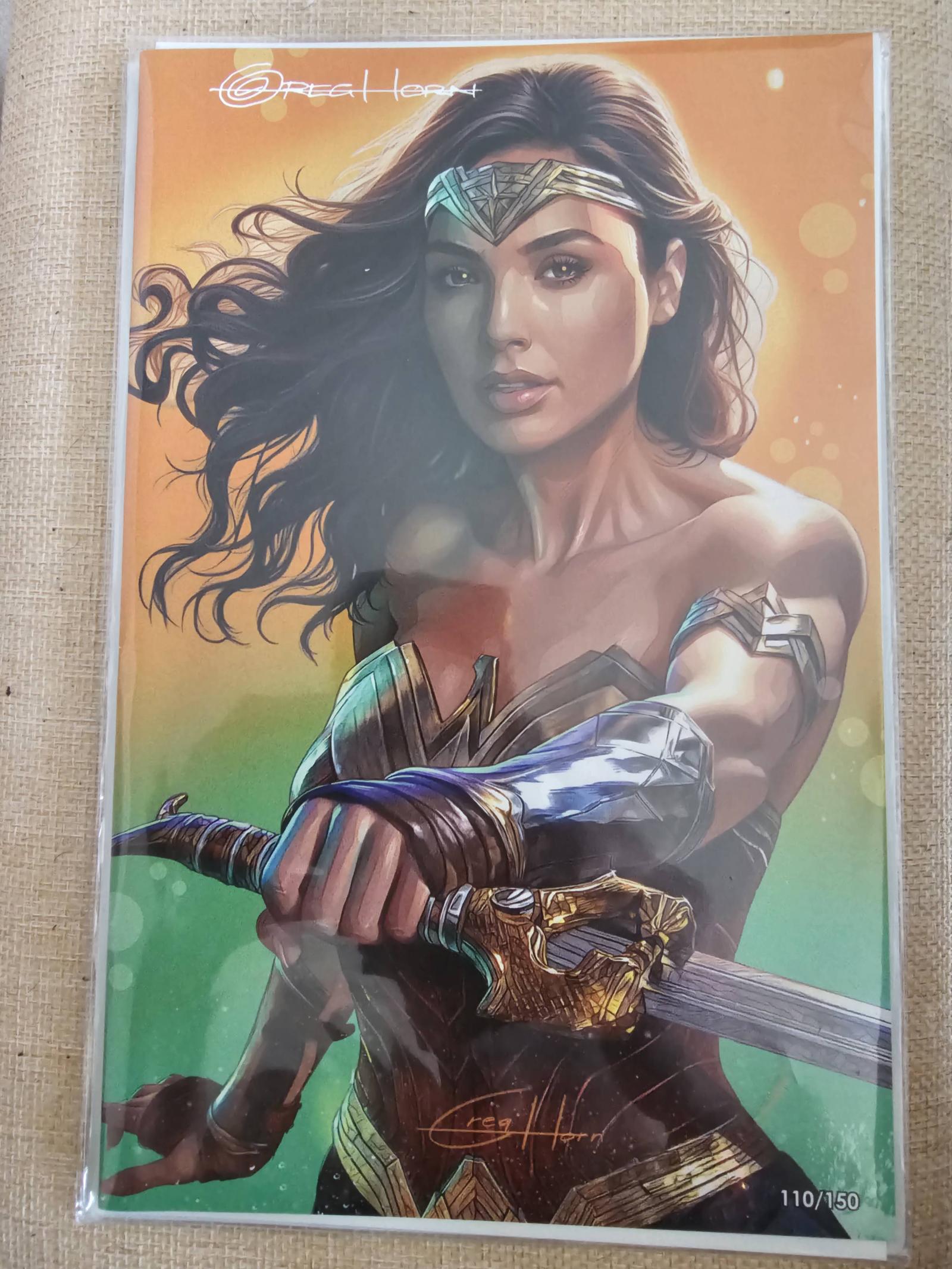 Near Mint, ungraded collectible — Female Force: Wonder Woman #1 (Greg Horn exclusive), numbered 110 of 150 and personally signed by Greg Horn with accompanying Certificate of Authenticity.