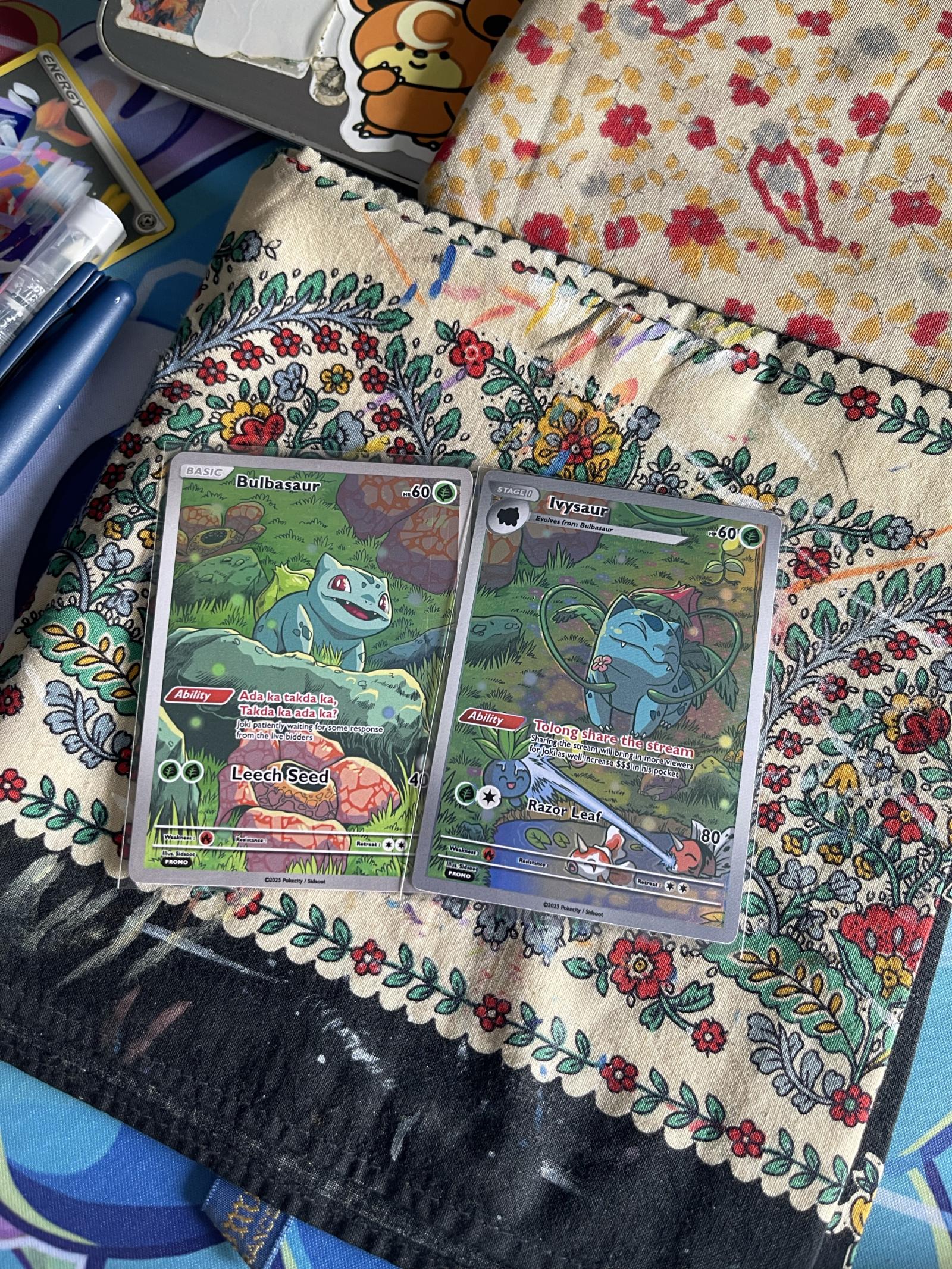 A pair of custom art prints featuring Bulbasaur and Ivysaur Pokémon cards. Each card showcases unique artwork with vibrant colors and special promo designs. Perfect for collectors or fans of original Pokémon custom art. Cards are displayed on a decorative floral cloth background.