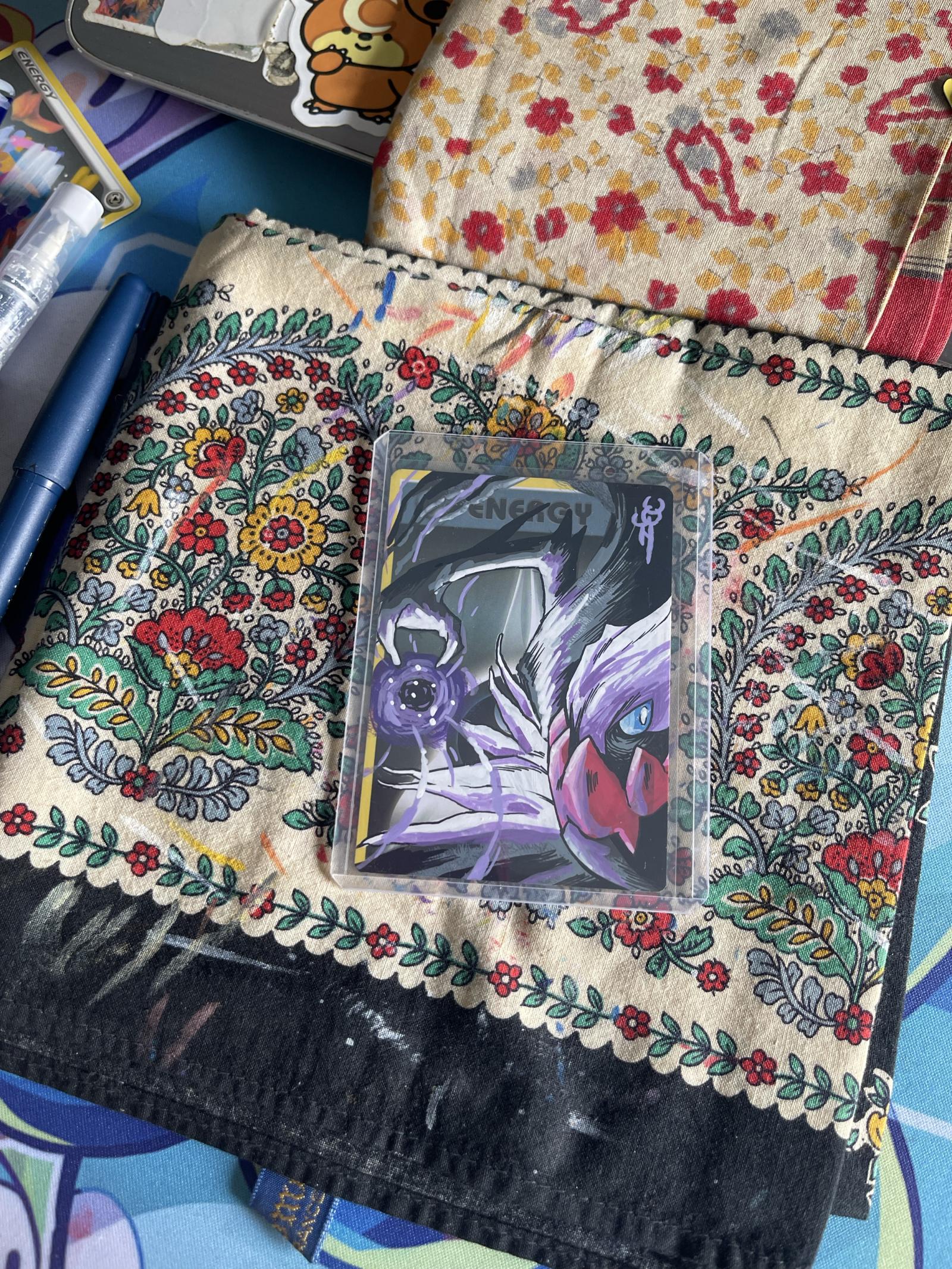 Unique custom artwork featuring a darkrai hand-painted Energy Pokémon card . The card is encased in a protective sleeve and showcases vibrant purple and black hues with detailed brushwork. Ideal for collectors and fans of custom Pokémon card art. Display or add to your collection with this one-of-a-kind piece.
