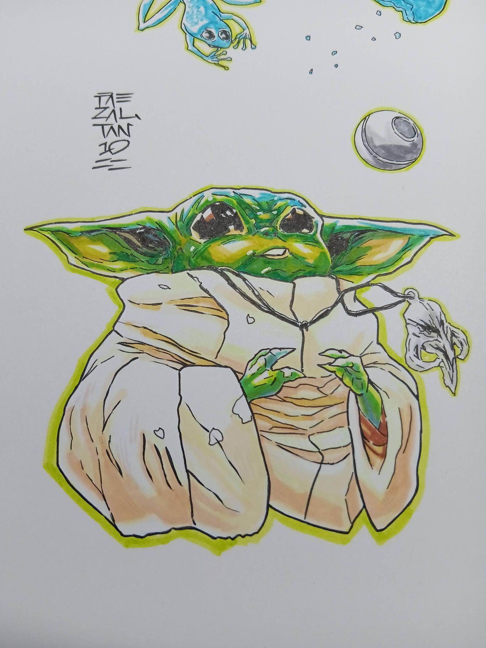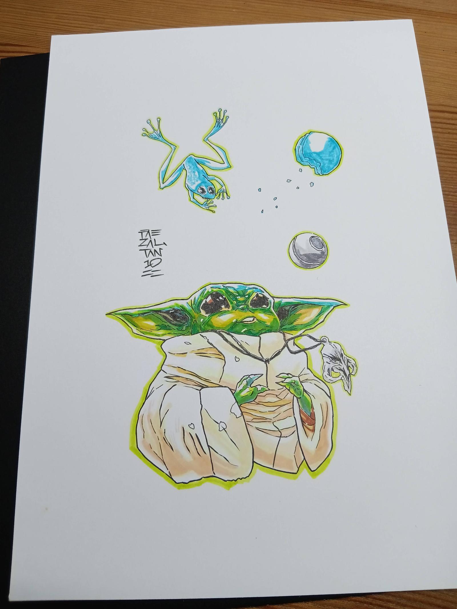 Original Art. Size: A4, 250 g/m Bristol illustration paper. Pen & illustration markers. Vibrant custom ink and marker illustration depicting a detailed and colorful rendering of Baby Yoda (Grogu) wearing his iconic robe. Perfect for fans of Star Wars and quirky, imaginative art pieces.