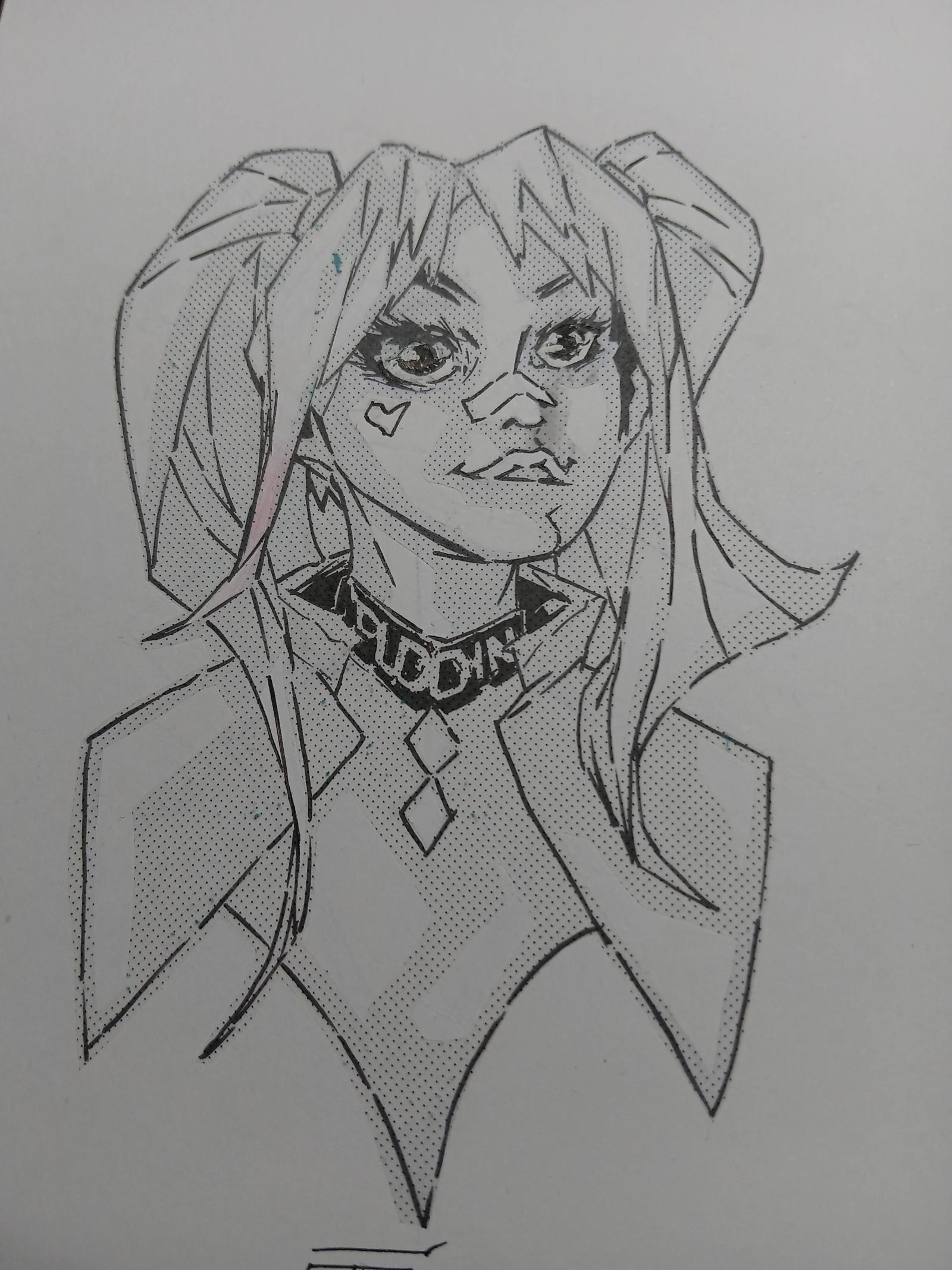 Original bust/head shot drawing of Harley Quinn. Size: B4, 150 g/m Bristol illustration paper. Pen & Screentone.