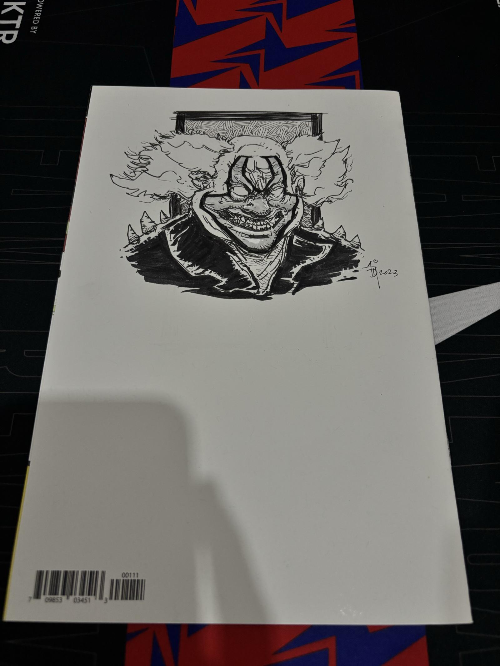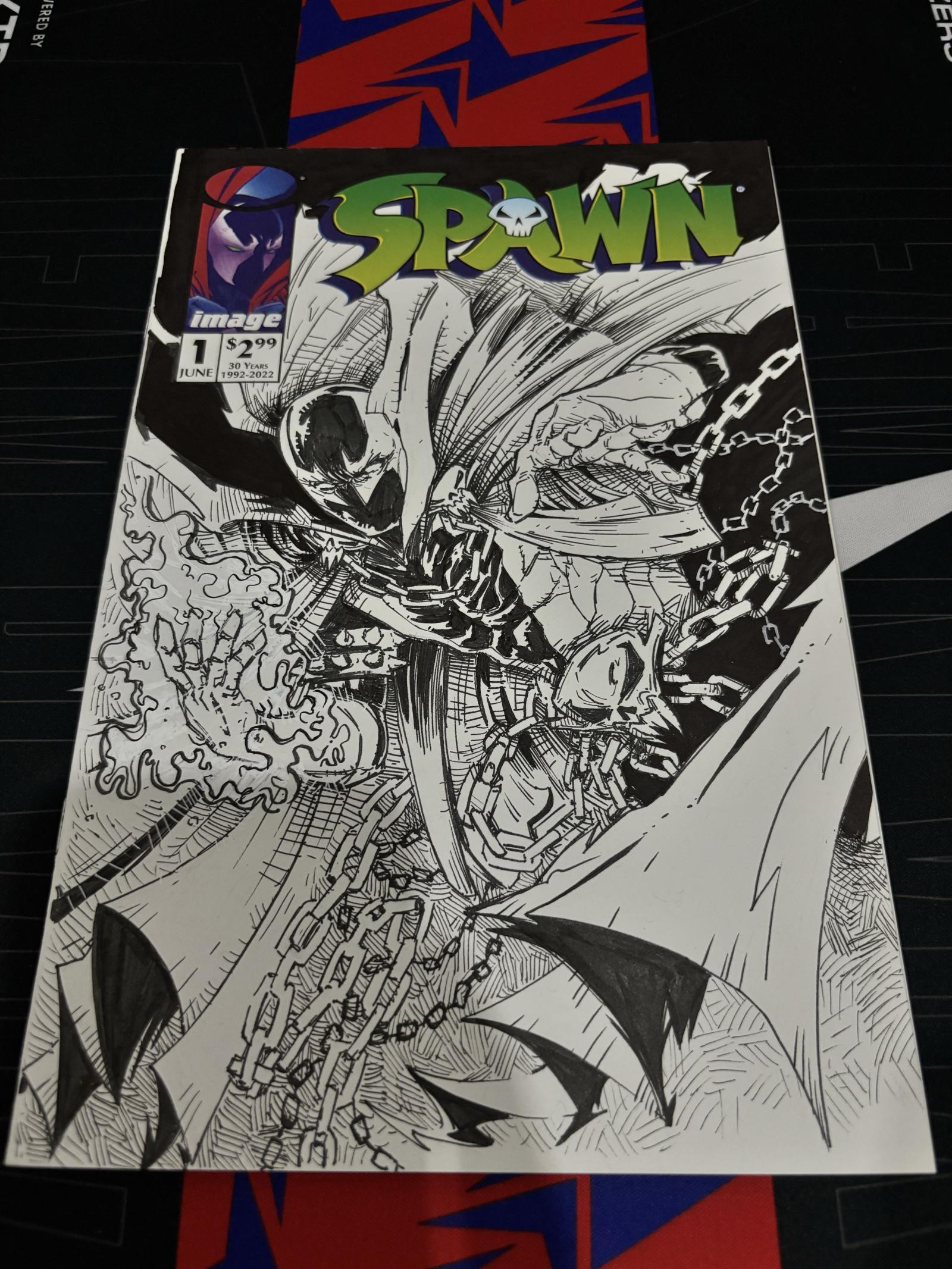 This collectible item features a custom ink sketch cover art on the front of Spawn #1 comic (June issue) from Image Comics, celebrating 30 years (1992-2022). The detailed black and white drawing showcases Spawn in dynamic action with chains and flowing cape. The back cover includes a signed monochrome sketch of a sinister clown figure, dated 2023. A unique piece combining comic art and custom illustration for fans and collectors.