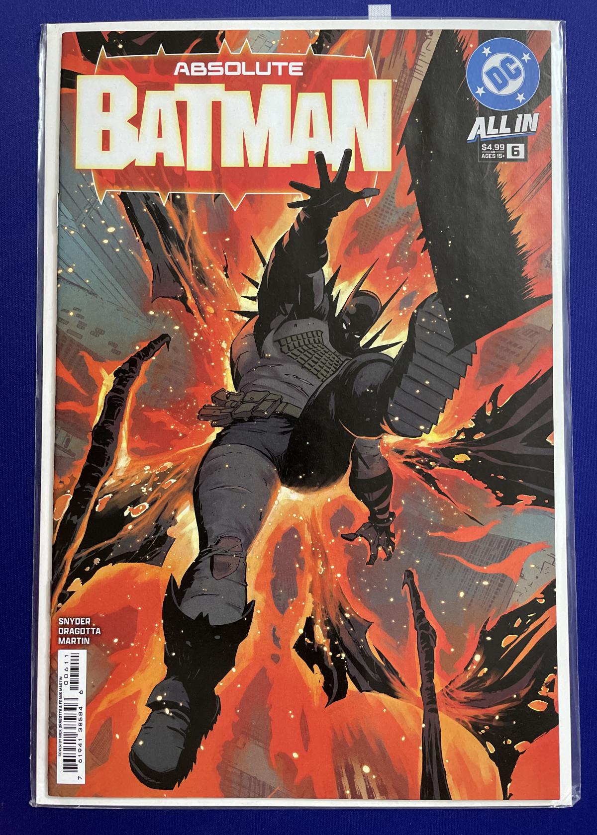 This is issue #6 of the Absolute Batman All In series, featuring dramatic cover art with Batman leaping through flames. The comic is written by Scott Snyder, with stunning illustrations by Nick Dragotta and coloring by Dave Stewart (credited as Martin on the cover). This collector's item is notable for its striking cover art and action-packed storytelling. The comic appears to be bagged and boarded for protection but is not slabbed or graded.