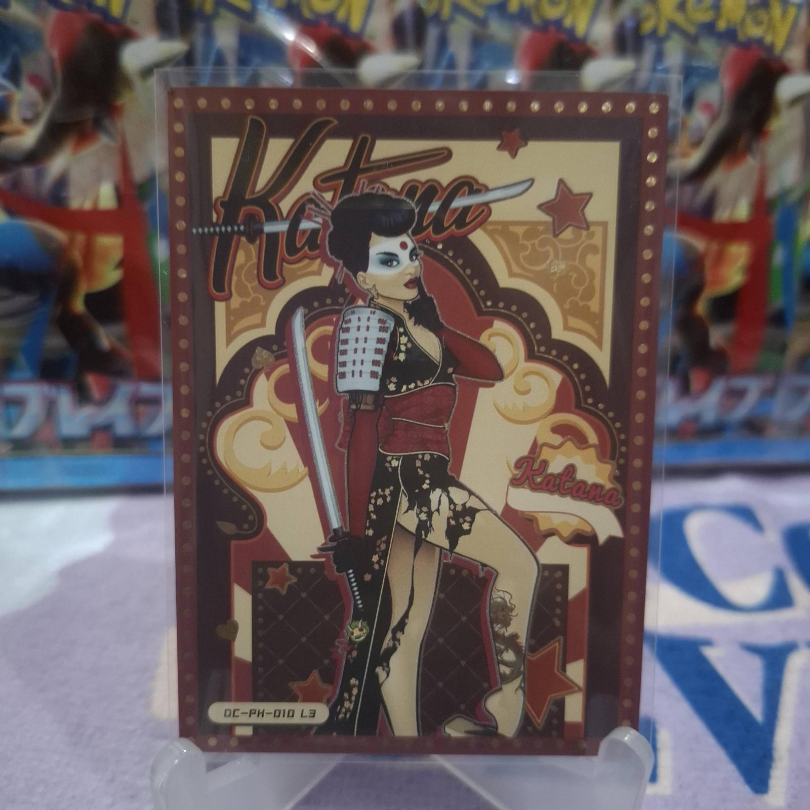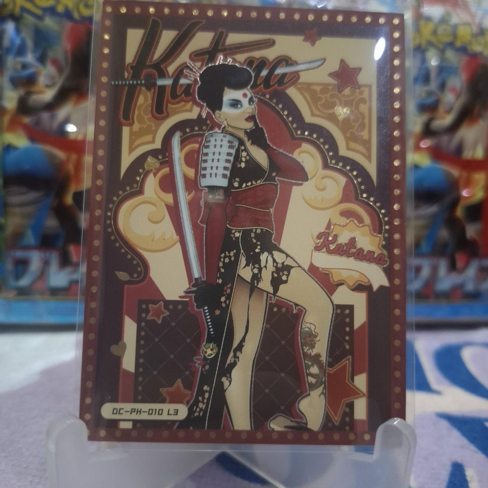A collectible DC Comics Bombshells trading card featuring Katana in an art-deco style. The card showcases vibrant colors and detailed artwork on the front, with the DC Comics Bombshells branding on the back. A great addition for fans of DC Comics and the Bombshells series.