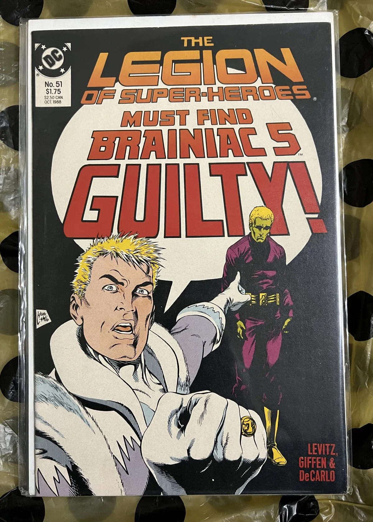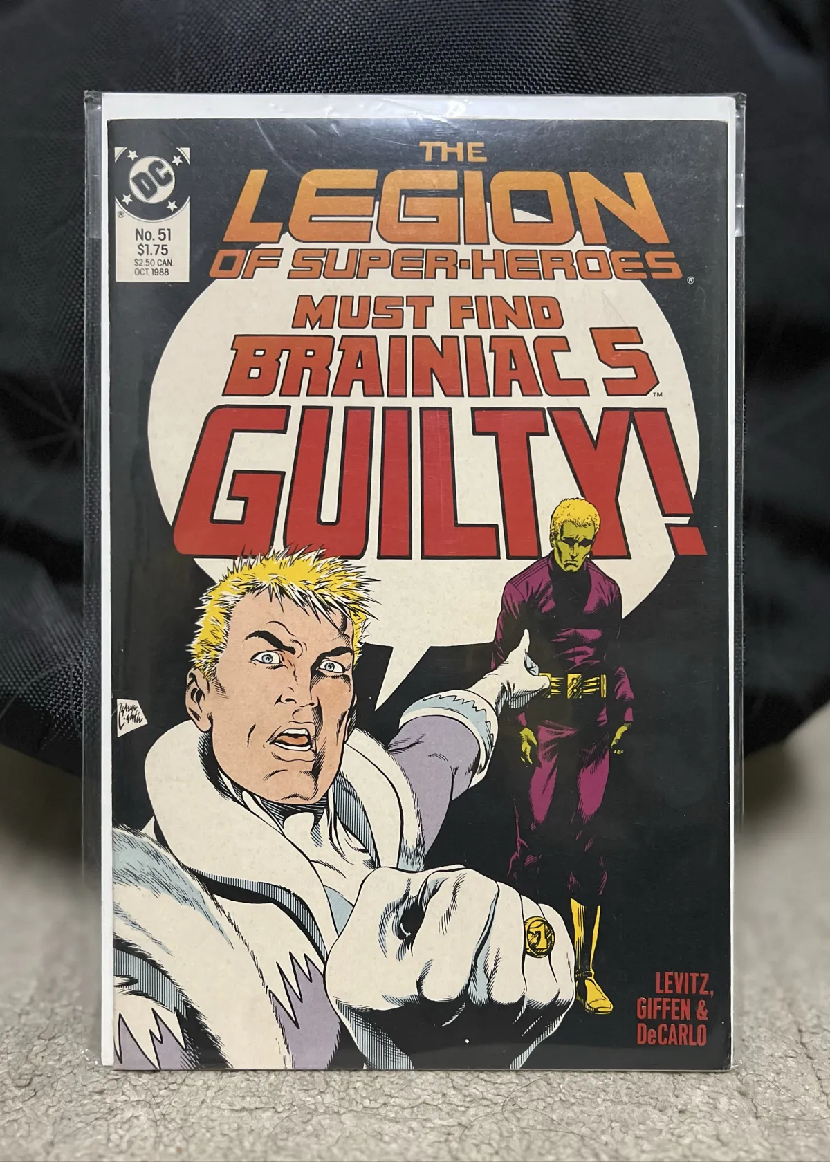 This listing is for The Legion of Super-Heroes issue #51, published by DC Comics in October 1988. This raw, ungraded comic features a dramatic cover proclaiming "Must Find Brainiac 5 Guilty!" with artwork credited to Levitz, Giffen & DeCarlo, notable creators known for their influential work on the series.