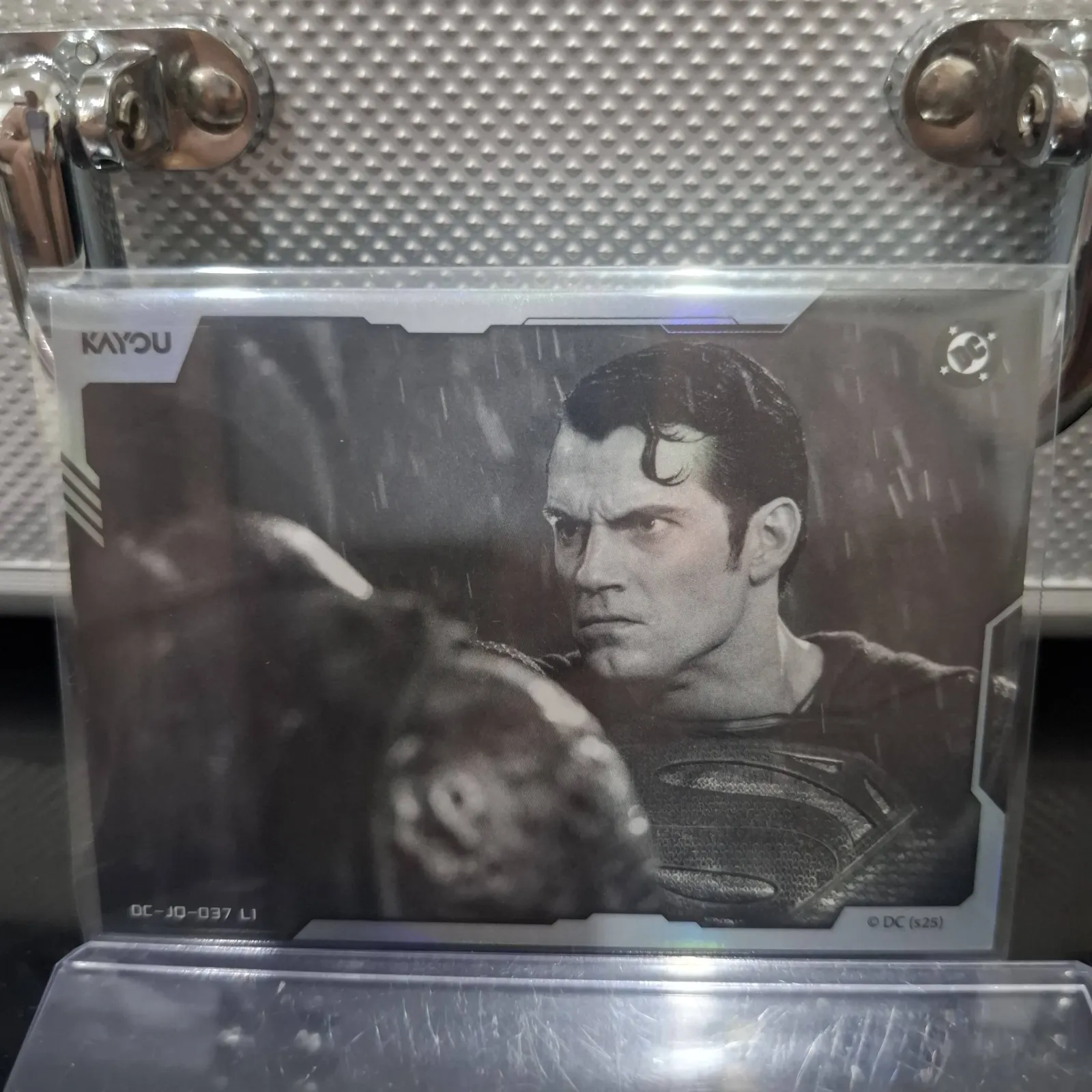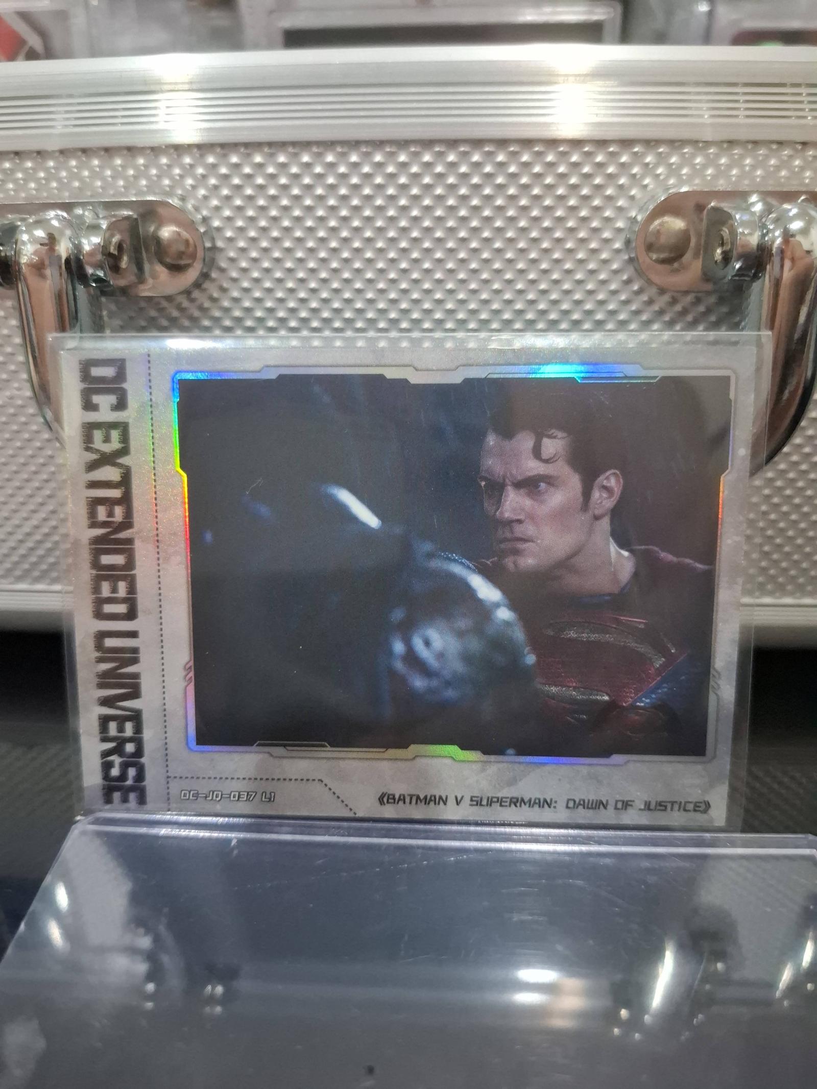 A DC Extended Universe trading card featuring a scene from 'Batman v Superman: Dawn of Justice' showcasing Superman. The card has a holographic border and is numbered 06-10-037 Li. It is kept in a protective sleeve for preservation.