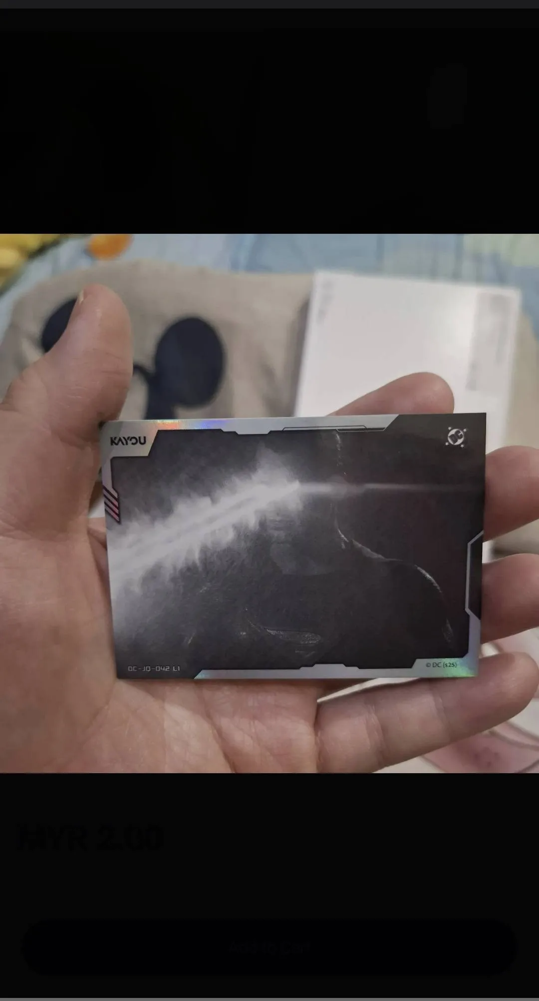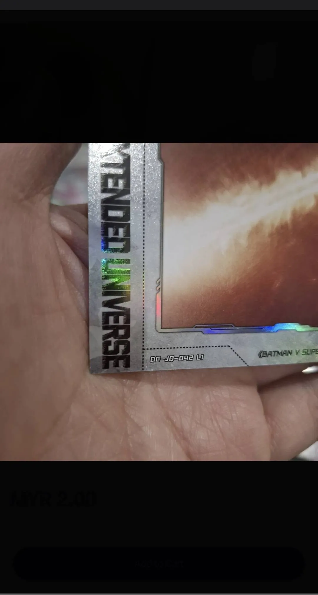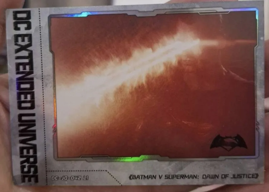 A collectible trading card from the DC Extended Universe featuring a scene from Batman v Superman: Dawn of Justice. The card has a holographic finish and depicts an energy blast. Perfect for fans and collectors interested in DC Comics movie memorabilia.