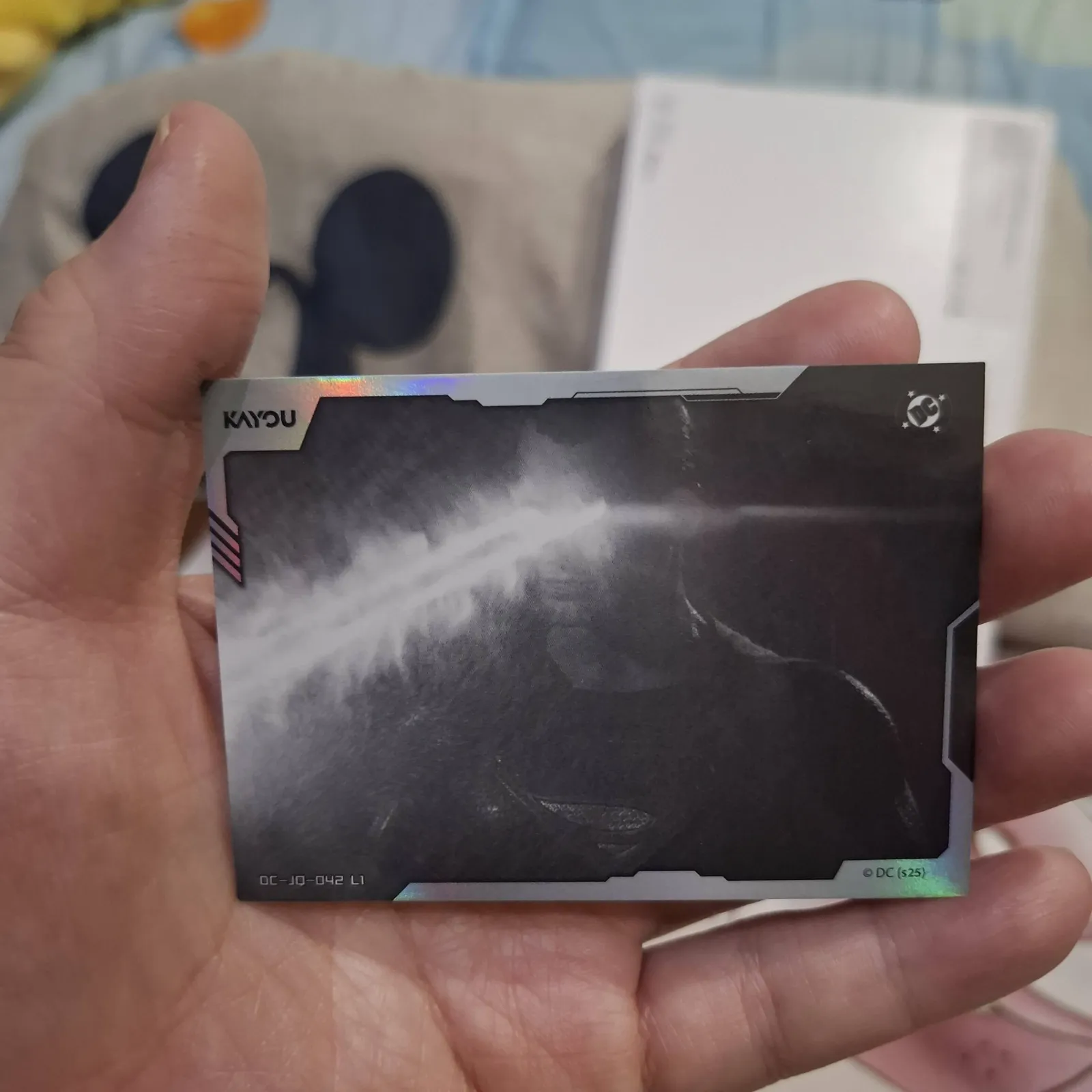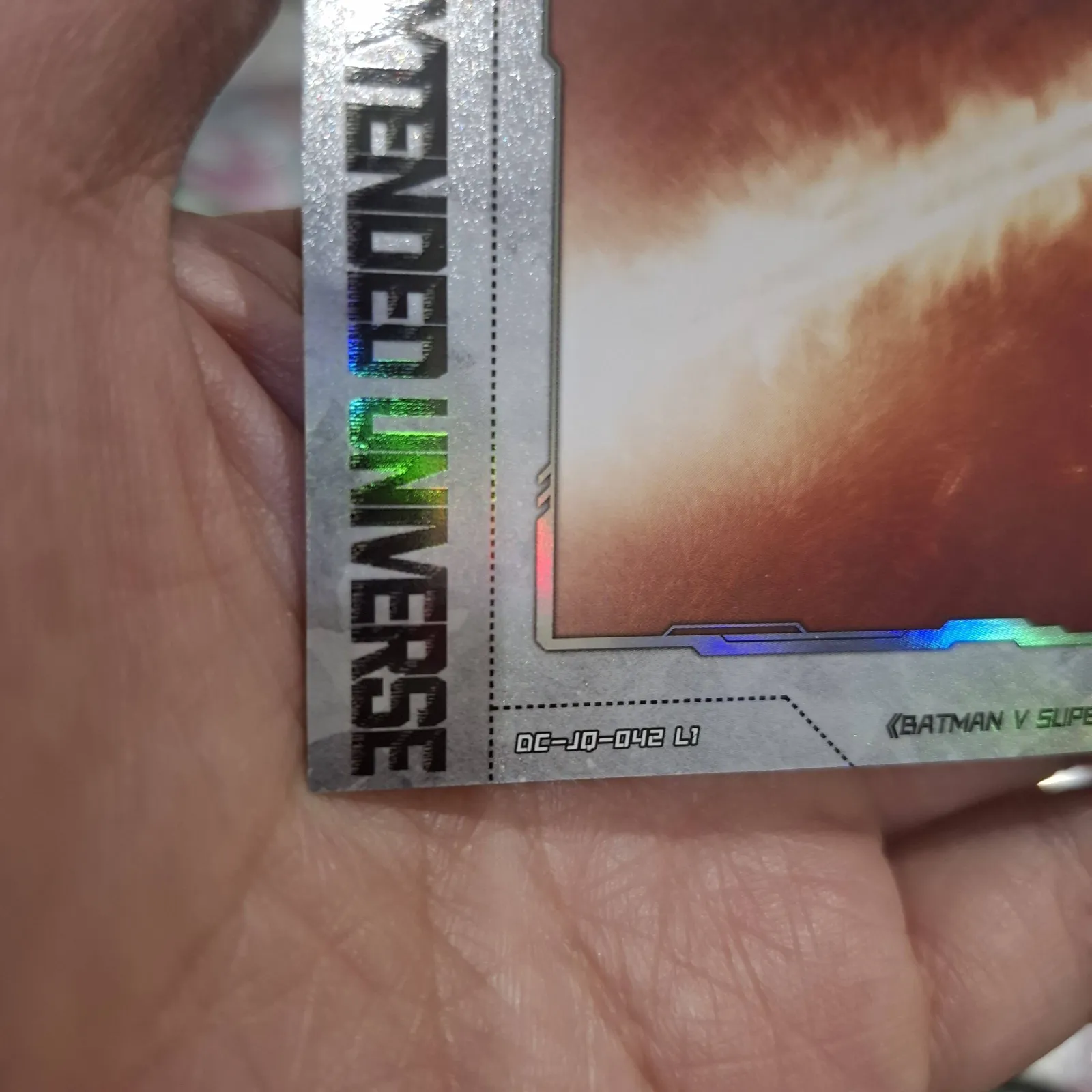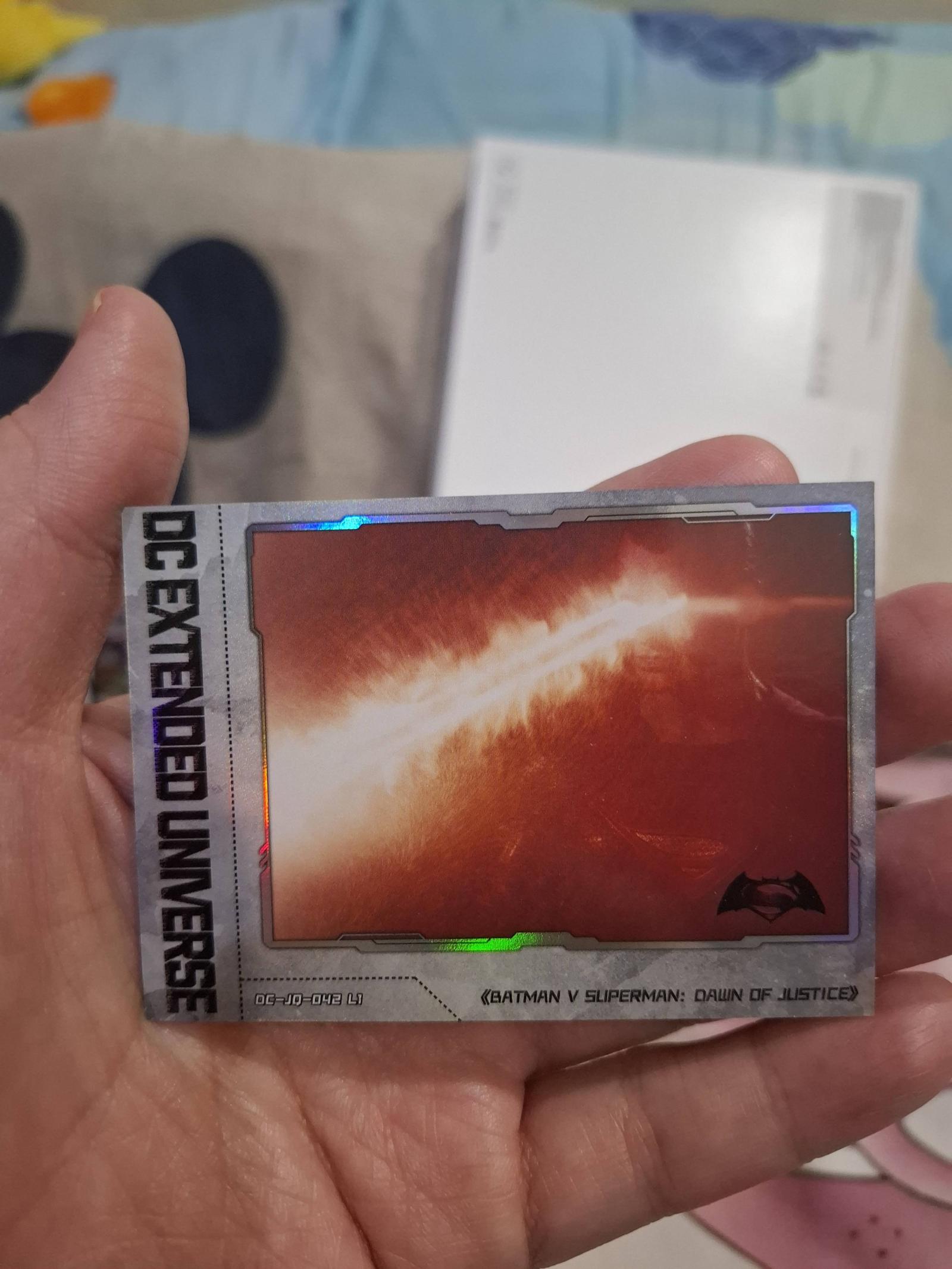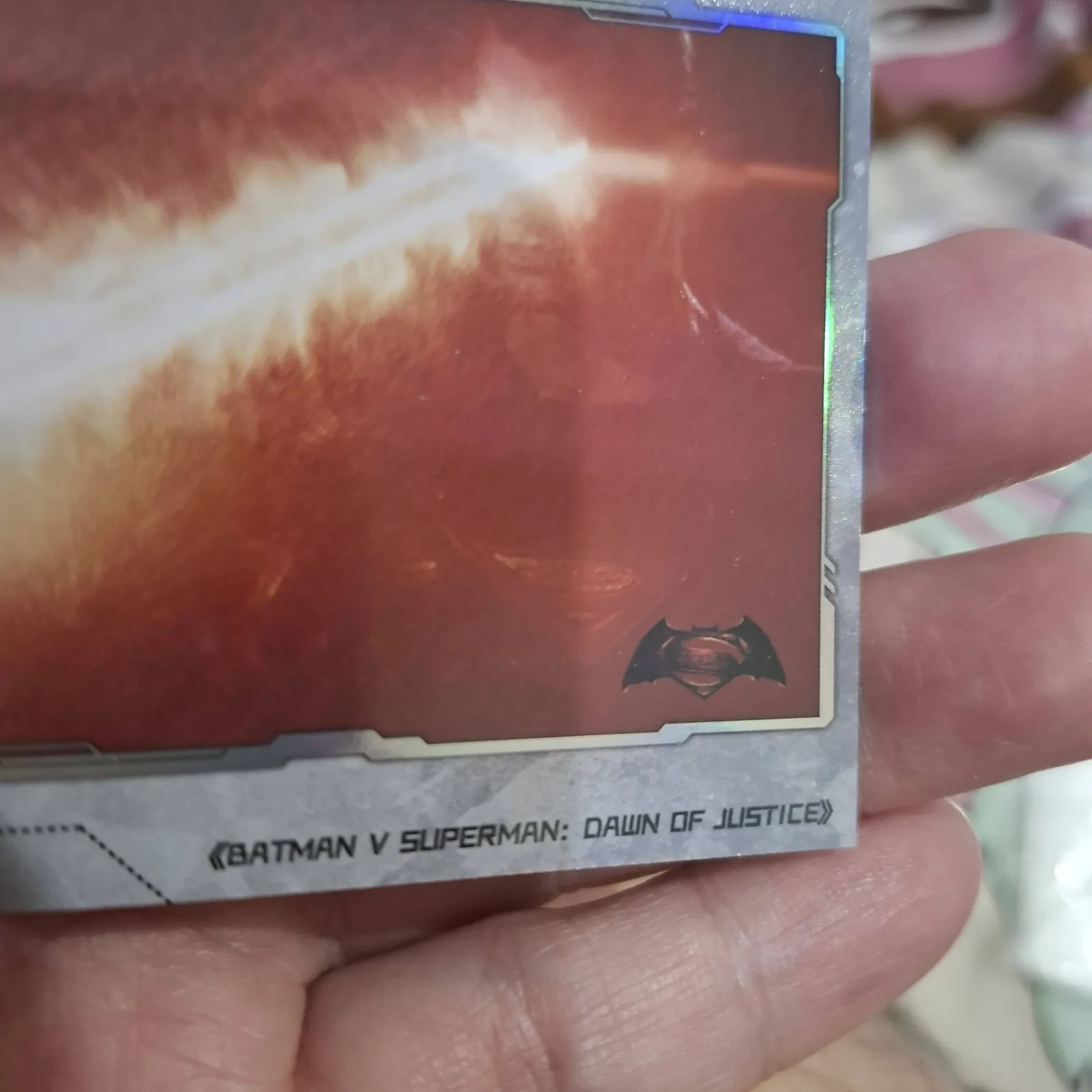 A collectible trading card from the DC Extended Universe featuring a scene from Batman v Superman: Dawn of Justice. The card has a holographic finish and depicts an energy blast. Perfect for fans and collectors interested in DC Comics movie memorabilia.