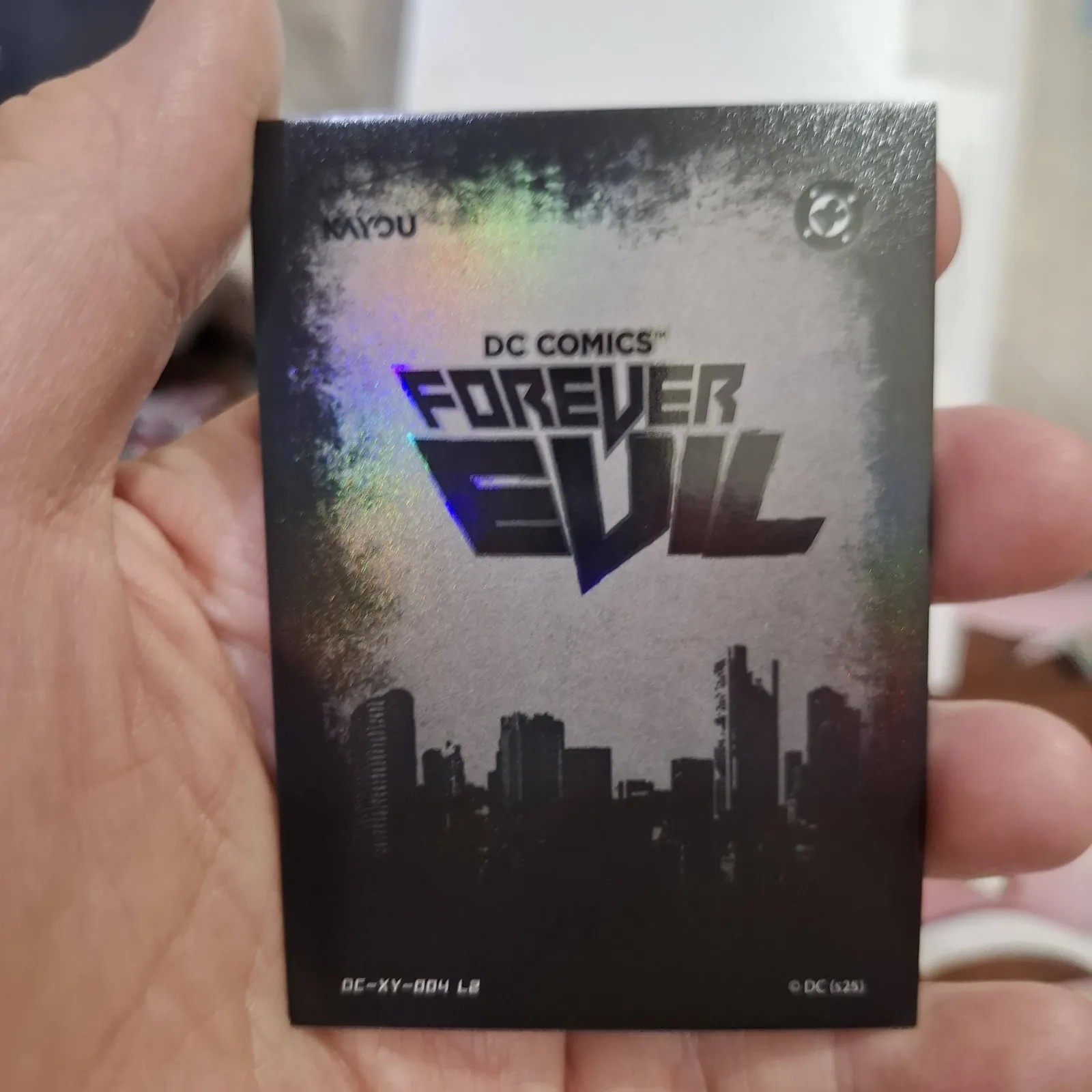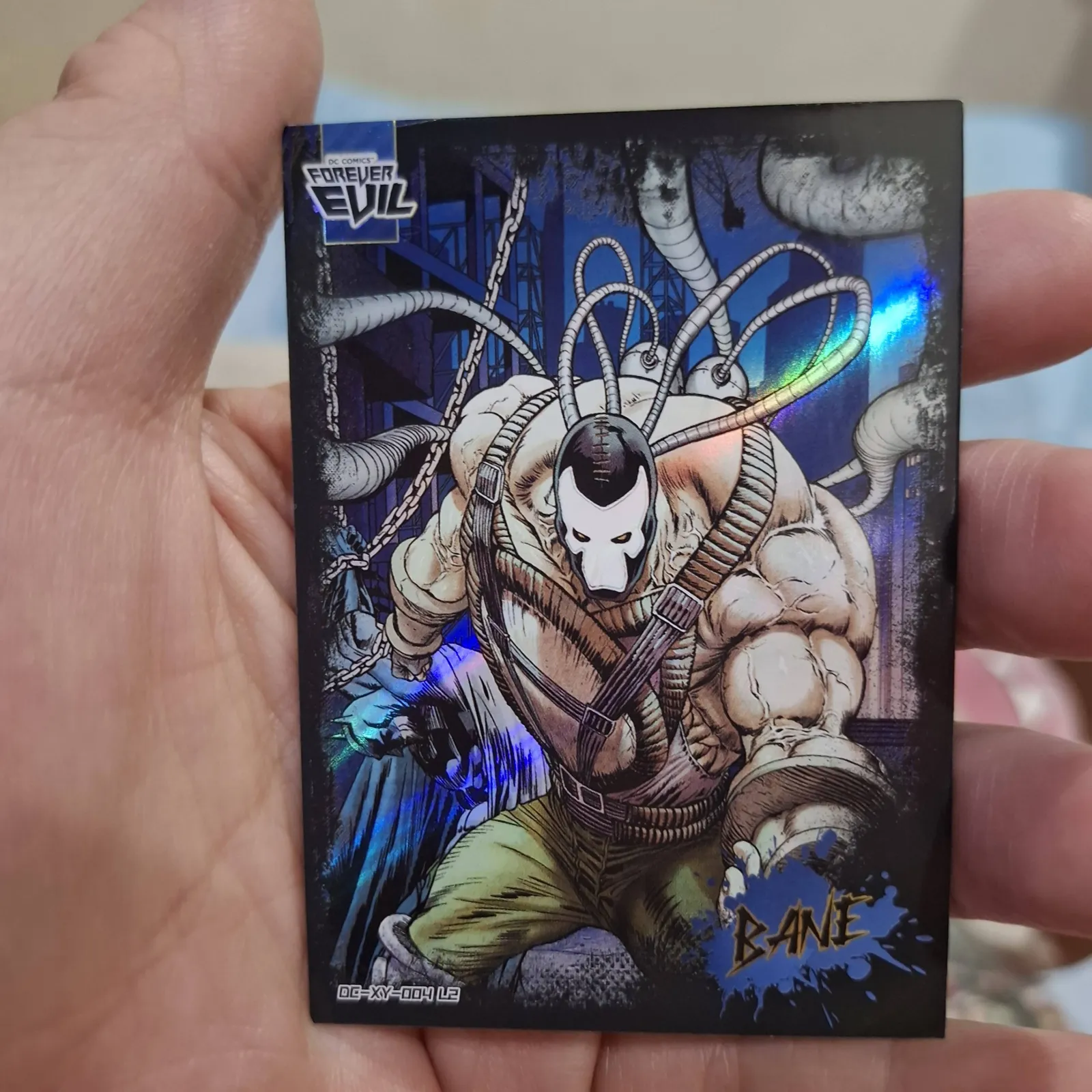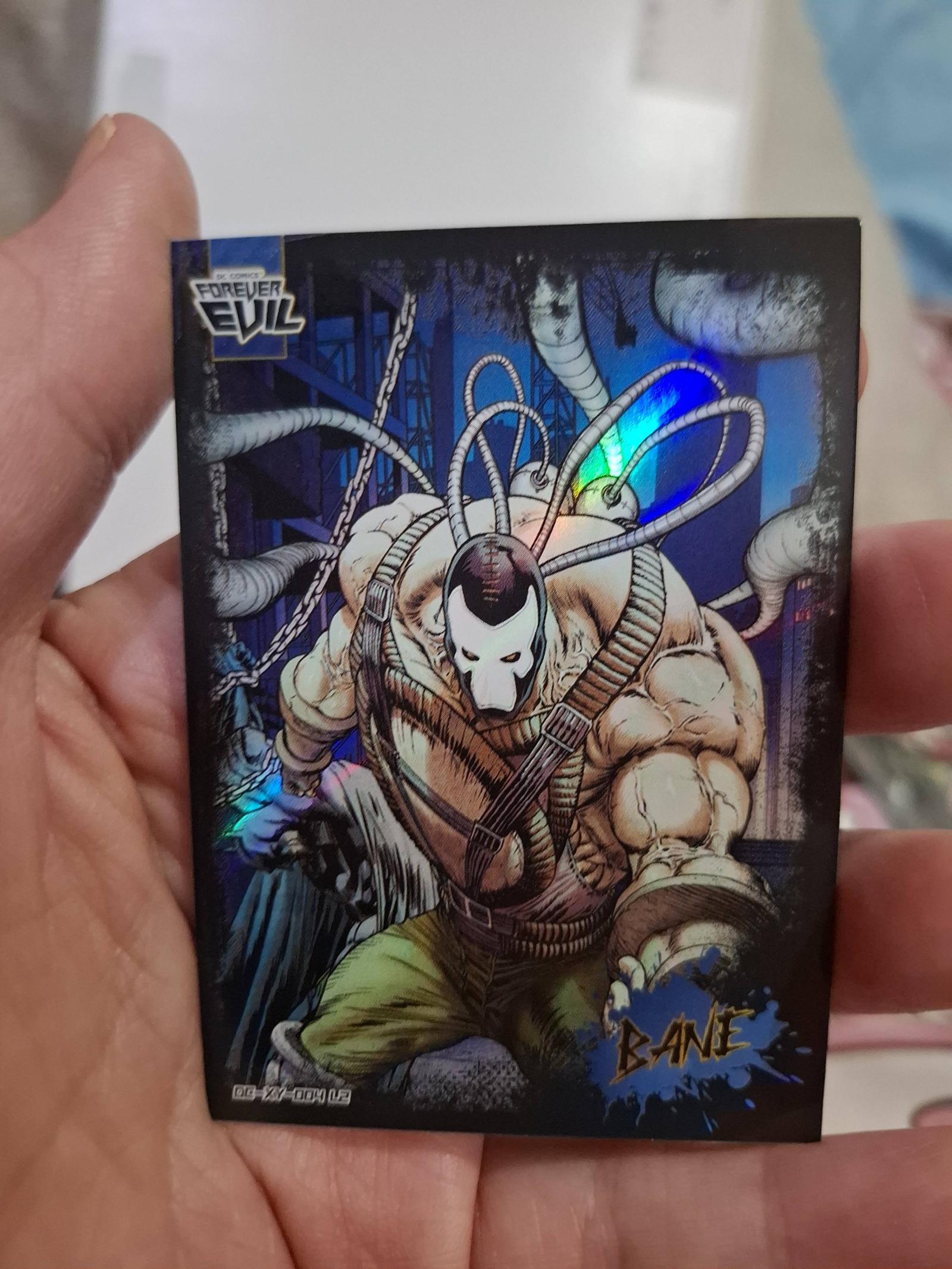 A glossy holographic trading card featuring the DC Comics villain Bane from the Forever Evil series. The card showcases detailed artwork with vibrant colors and reflective holographic accents. A great collectible for fans of DC Comics and comic book trading cards.