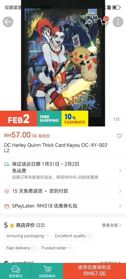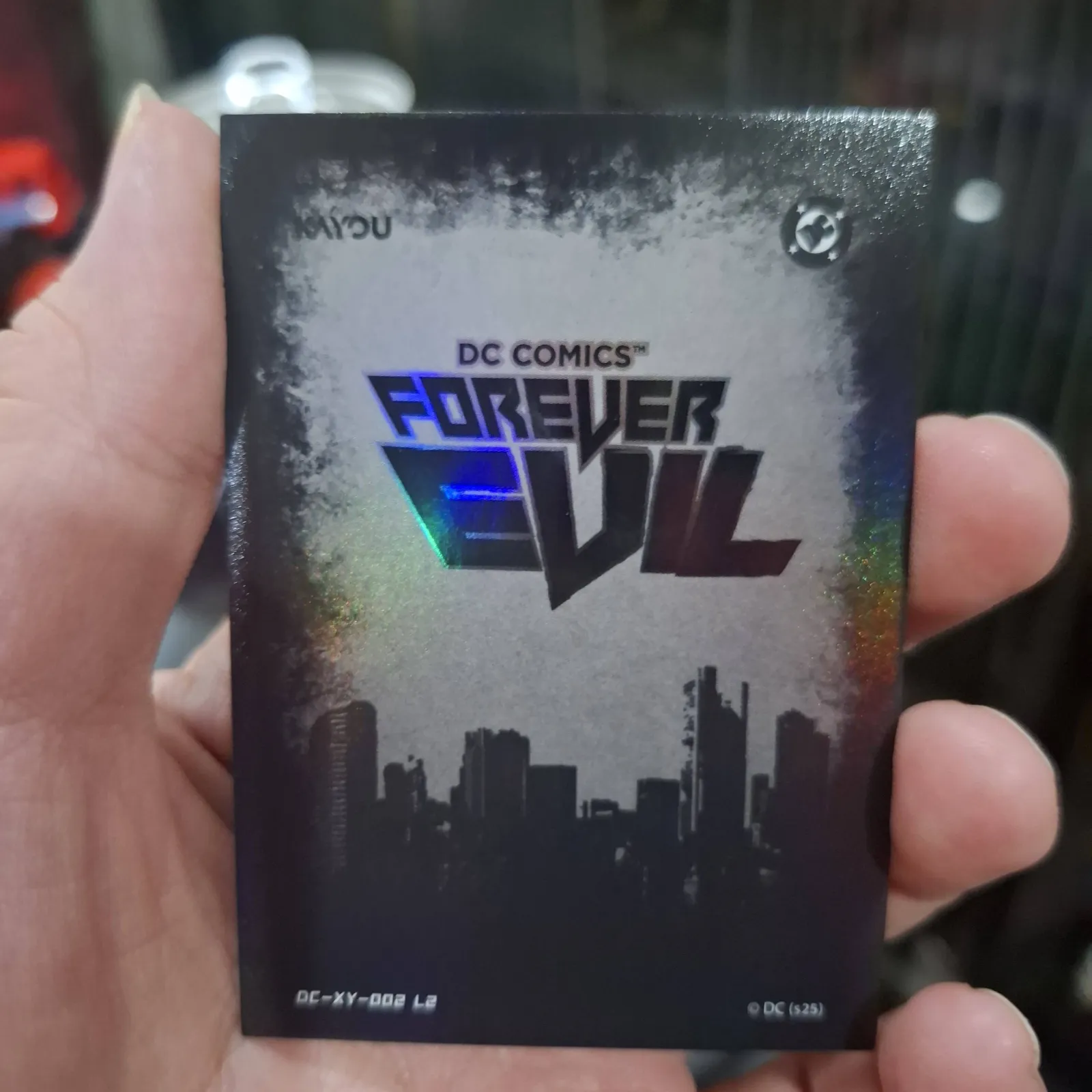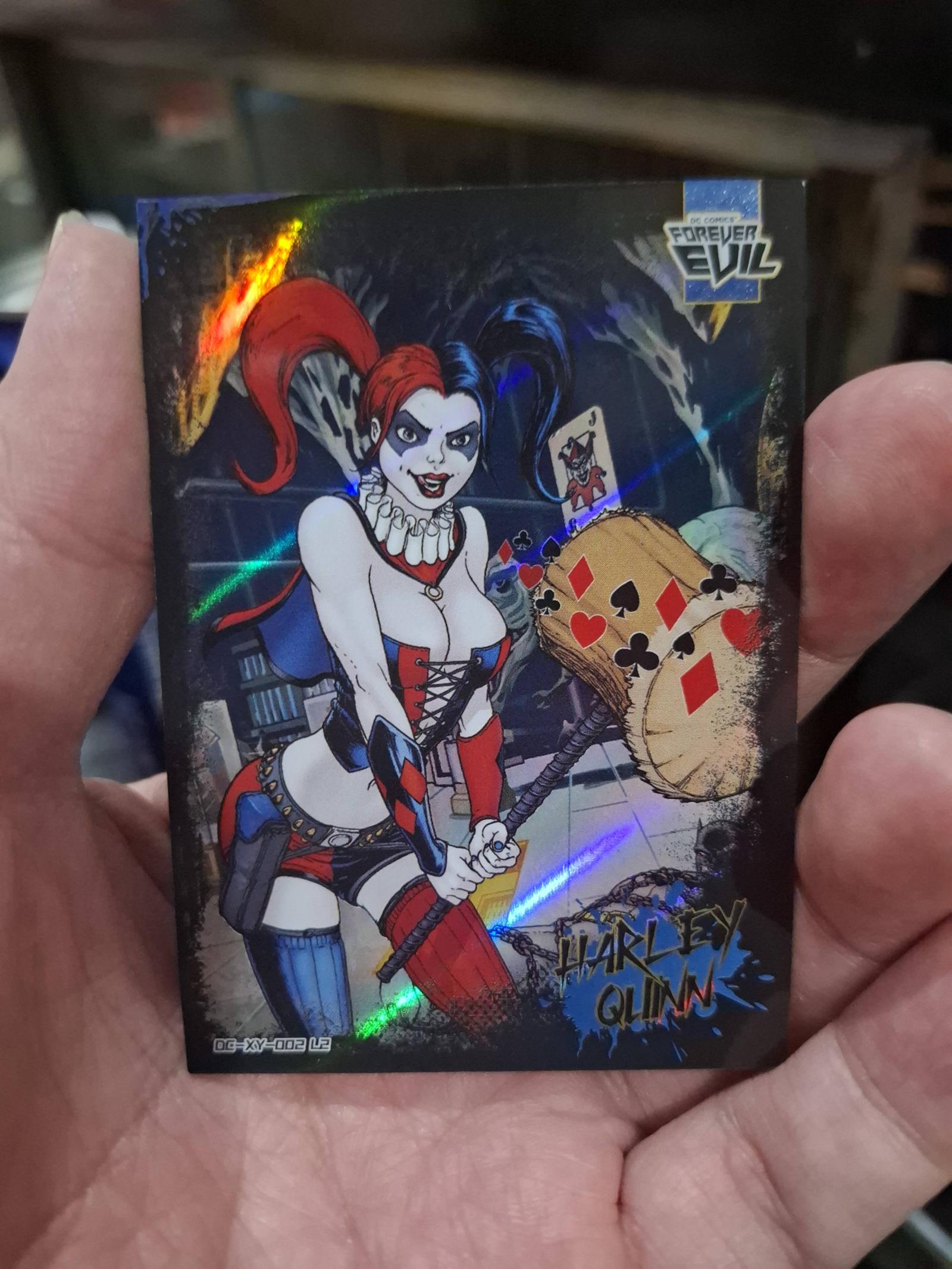 A holographic trading card featuring Harley Quinn from the DC Comics Forever Evil series. The card showcases vibrant artwork of Harley Quinn holding her signature oversized mallet with a background that enhances the collectible appeal. A must-have for DC Comics and Harley Quinn fans.