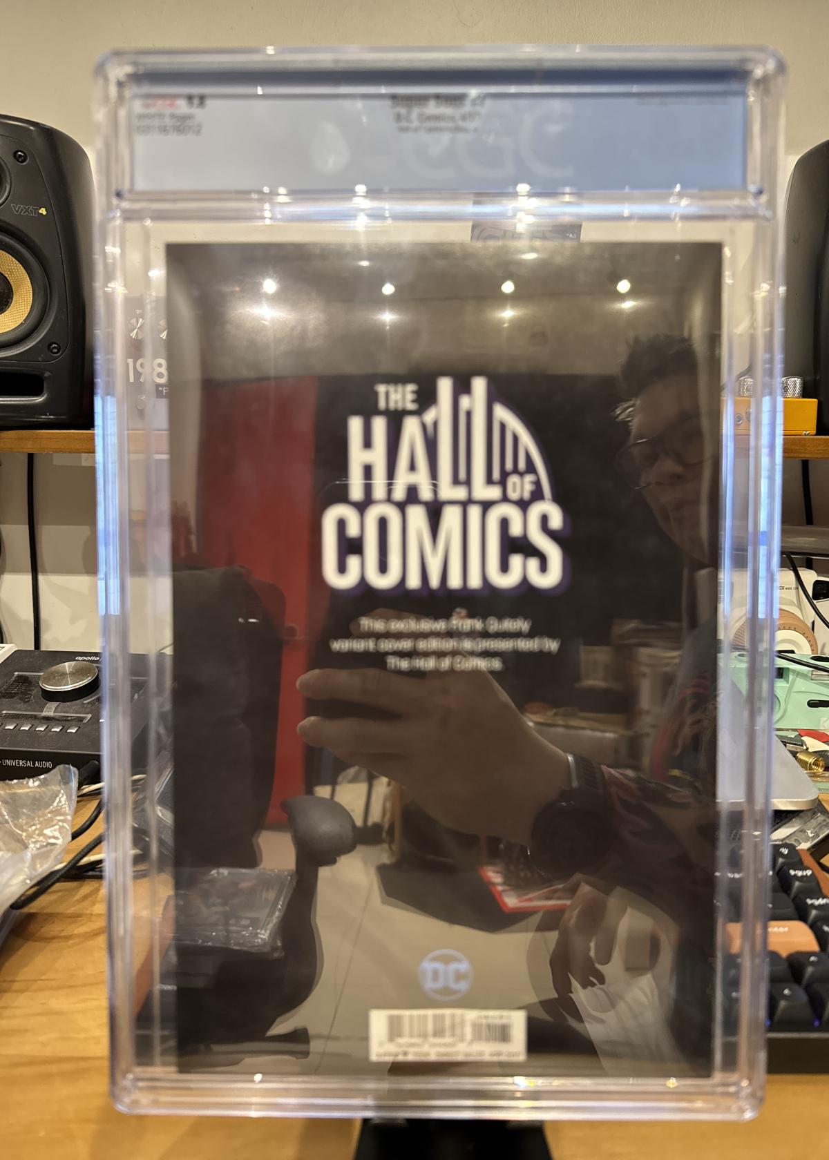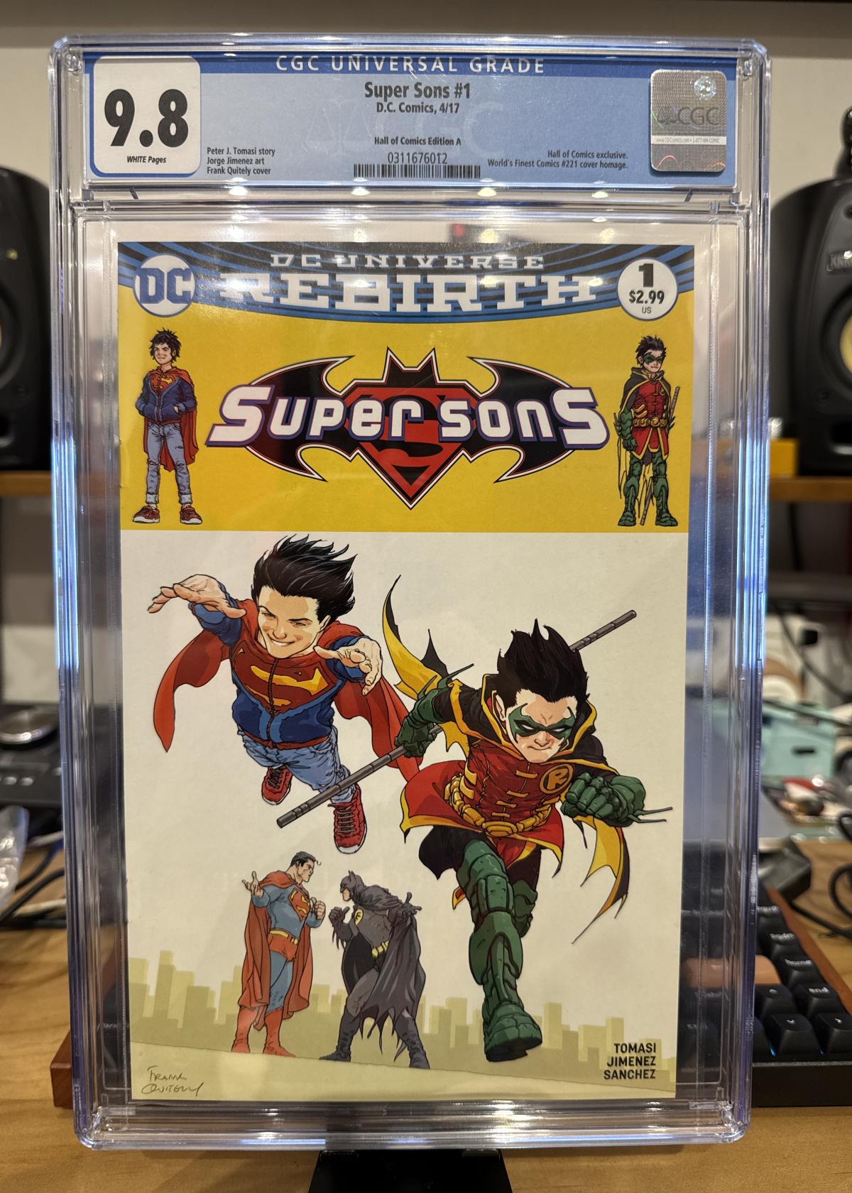 This is a slabbed, CGC graded 9.8 copy of Super Sons #1, Hall of Comics Edition A. The story is by Peter J. Tomasi with interior art by Jorge Jimenez and a cover by Frank Quitely. This edition is a Hall of Comics exclusive with a cover that pays homage to World's Finest Comics #221. A highly collectible addition, especially with its variant cover and pristine CGC 9.8 grade.