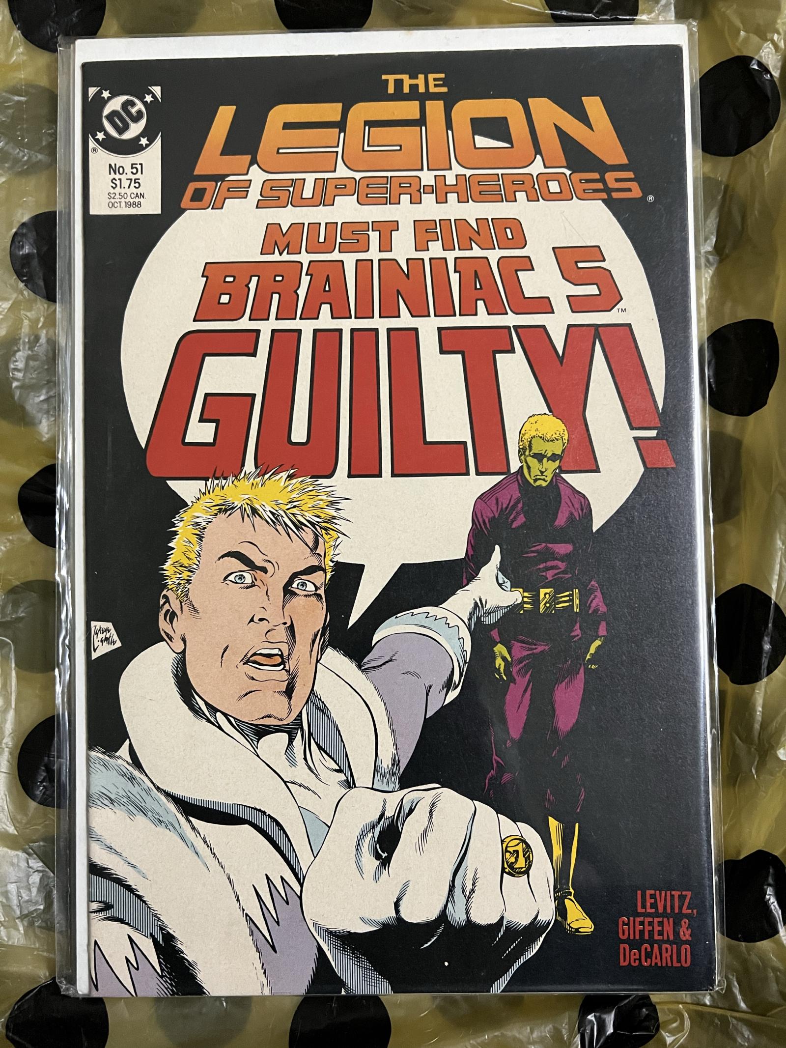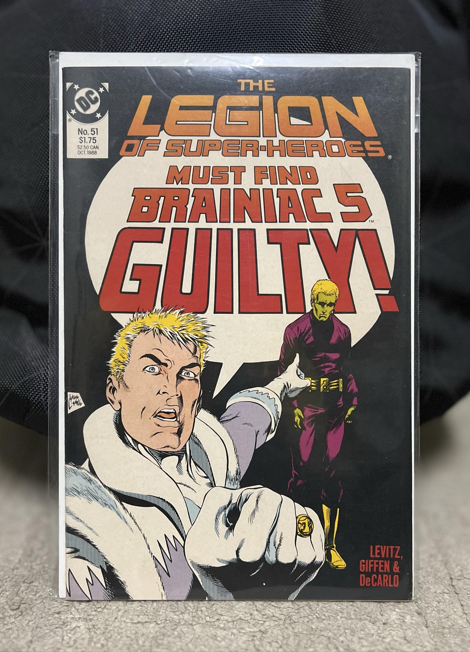 This listing is for The Legion of Super-Heroes issue #51, published by DC Comics in October 1988. This raw, ungraded comic features a dramatic cover proclaiming "Must Find Brainiac 5 Guilty!" with artwork credited to Levitz, Giffen & DeCarlo, notable creators known for their influential work on the series.