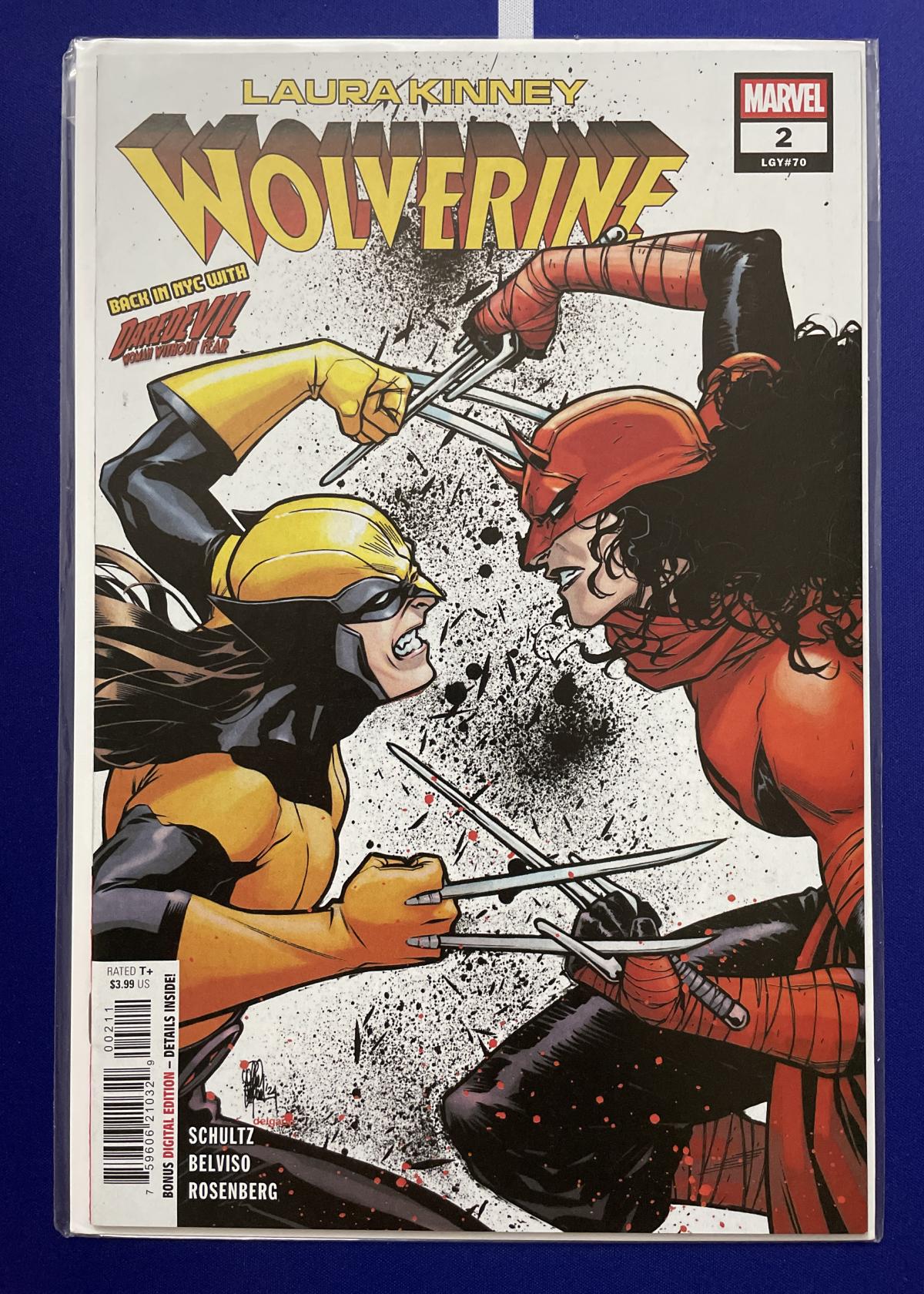 This comic features an intense showdown between Laura Kinney (Wolverine) and Daredevil, as seen on the dynamic cover artwork by artist Elena Casagrande. Written by Stephanie Phillips, with artwork by Robert Gill and colors by Matt Milla, this issue is part of the latest Wolverine series. Notable for its action-packed depiction and the 'Back in NYC with Daredevil' storyline, this issue is a great addition for any Marvel or X-Men collector. The comic is bagged and boarded for protection but is not officially graded or slabbed.