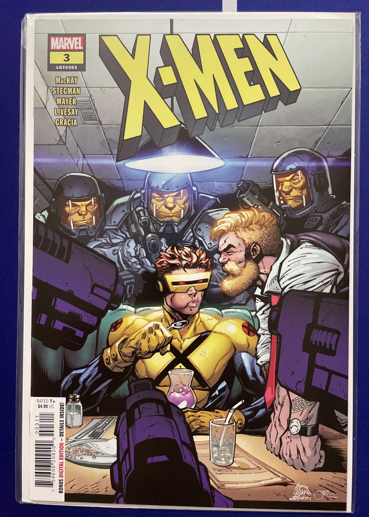 This issue of X-Men, with striking cover art by Ryan Stegman, presents an intense interrogation scene featuring Cyclops. Written by MacKay with contributions from Stegman, Mayer, Livesay, and Gracia, this comic is part of Marvel's ongoing X-Men series. The cover displays Cyclops confronted by armed sentinels and a mysterious bearded interrogator, showcasing the dynamic story and artistry within. The comic is bagged and boarded but not graded or slabbed. This issue includes a bonus digital edition, making it a collectible for fans.