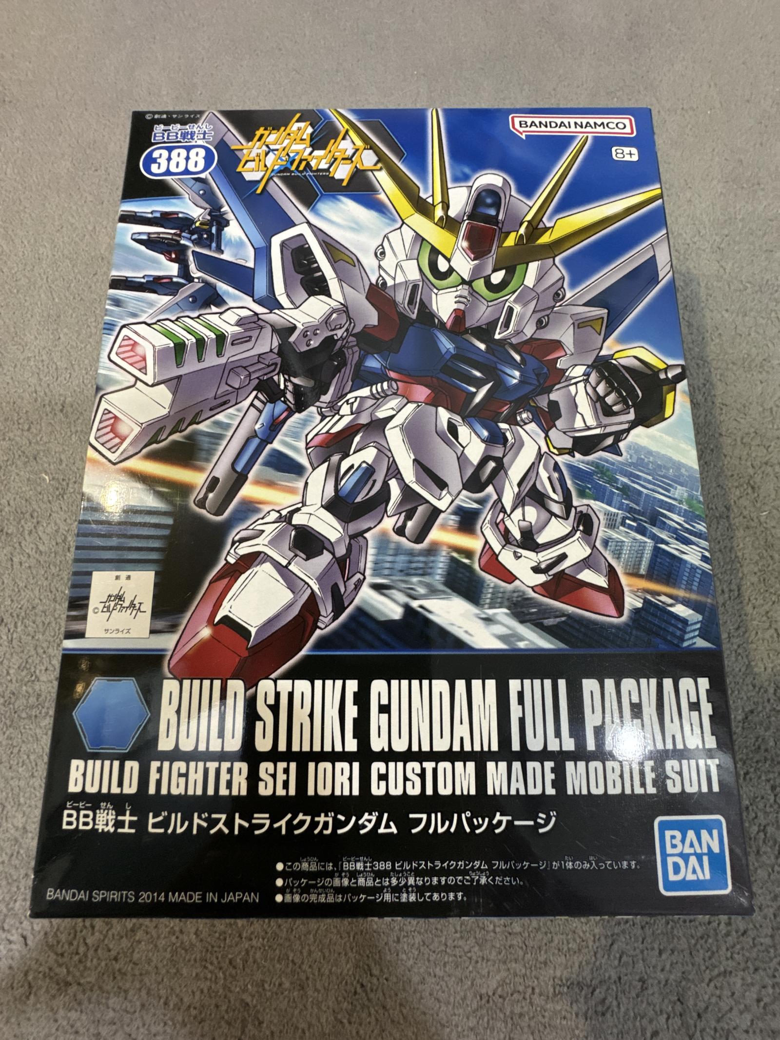 This is a Bandai BB Senshi 388 Build Strike Gundam Full Package diecast model kit, depicting the Build Fighter Sei Iori custom made mobile suit. Suitable for ages 8 and up, made in Japan by Bandai Spirits in 2014. The box features colorful artwork showcasing the Gundam with full weapons and armor. Perfect for collectors and Gundam fans.