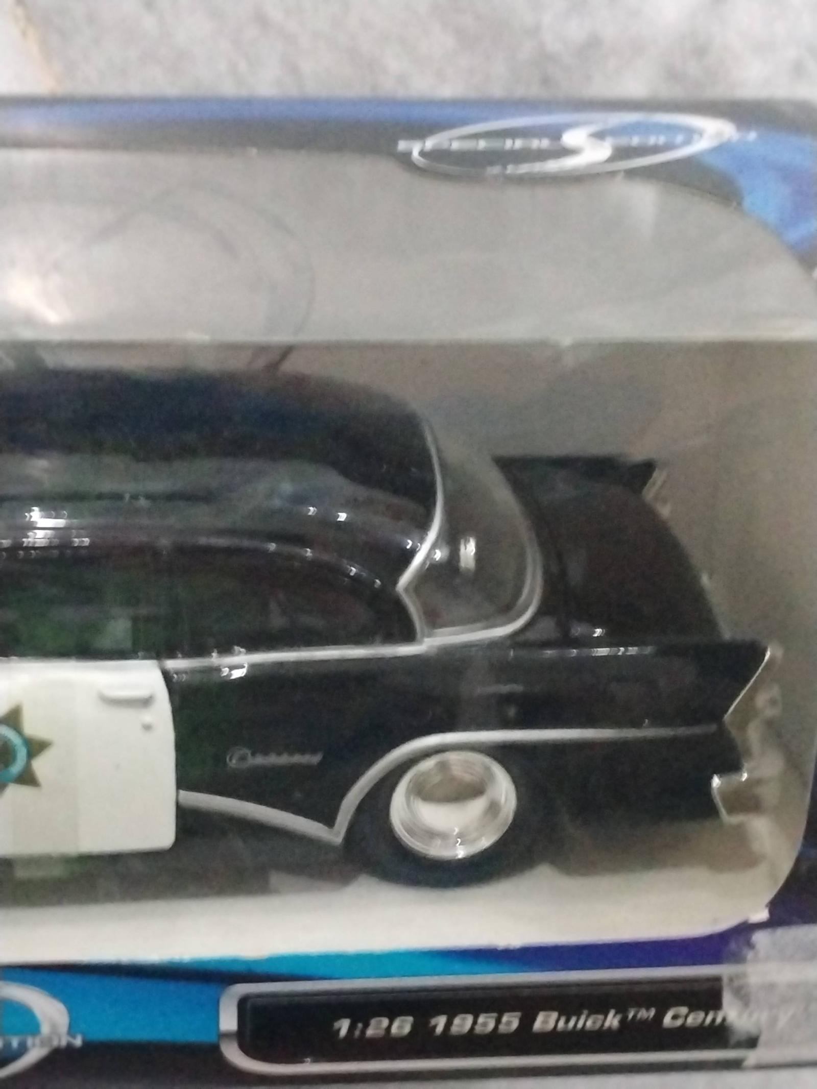 Near Mint, ungraded Maisto Special Edition 1:26 die-cast replica of a 1955 Buick in black-and-white police livery. The die‑cast body is heavy and solid with crisp period styling lines, detailed chrome trim, simulated chrome hubcaps, hood ornament and accurate police markings including a sheriff‑style star decal on the door. No visible paint chips, dents, or playwear on the model itself from my inspection; overall vehicle condition is consistent with Near Mint.